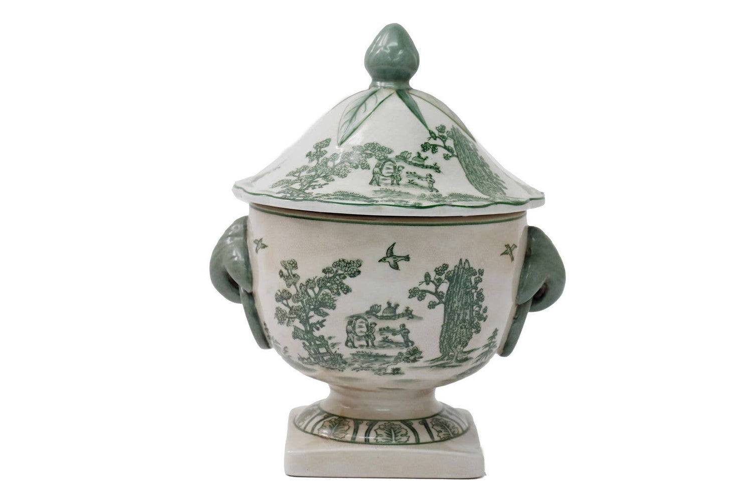 Extra Large White and Green Chinoiserie-Inspired Geometric Lidded Jar