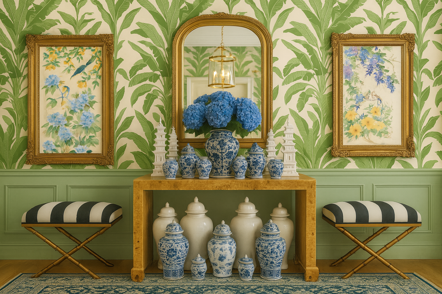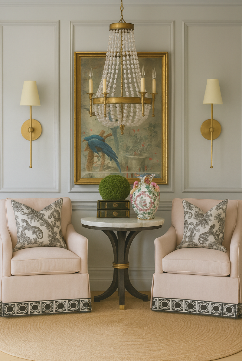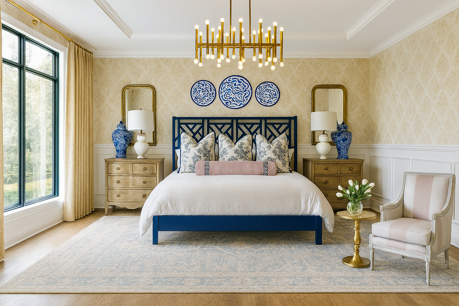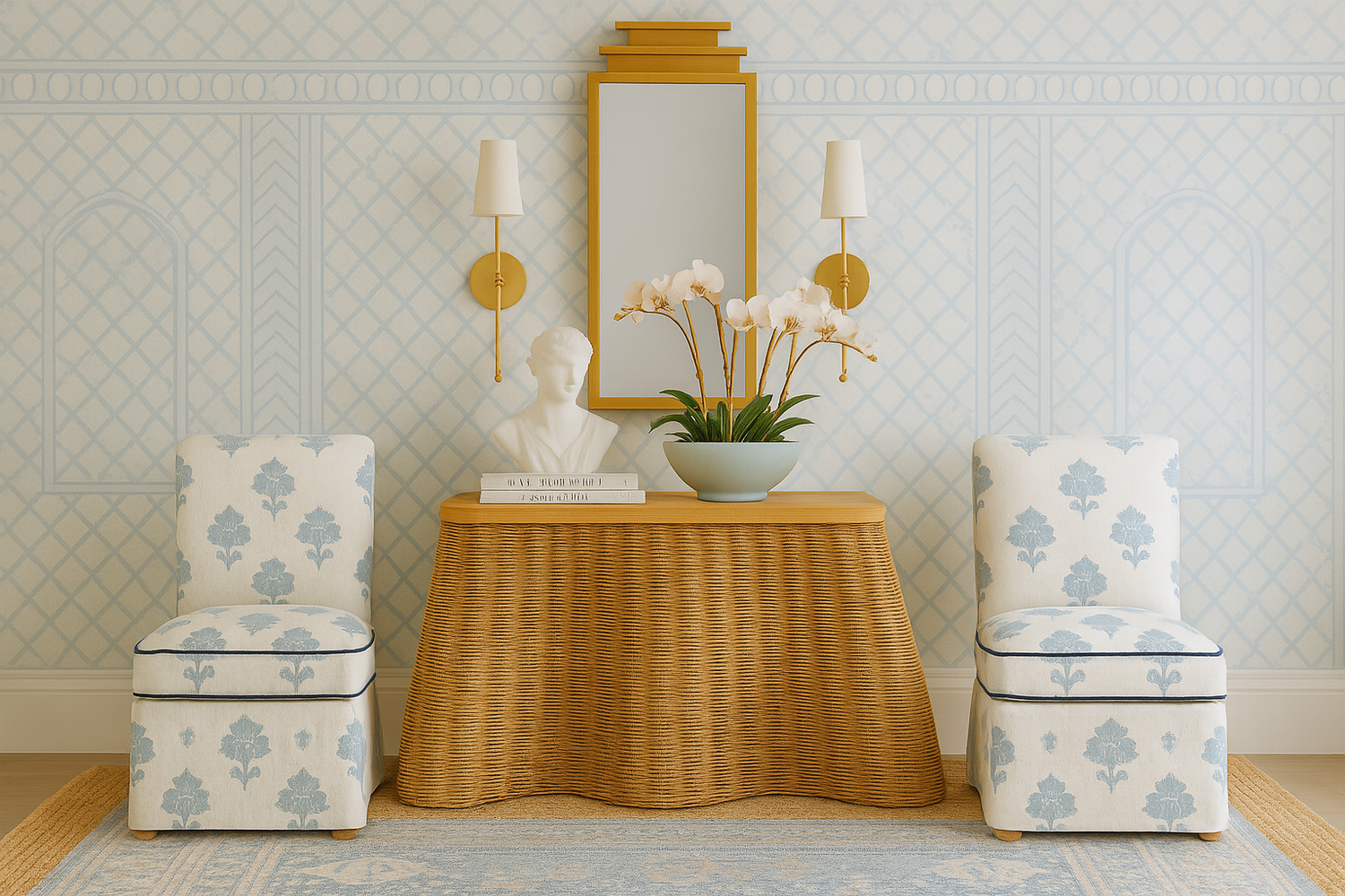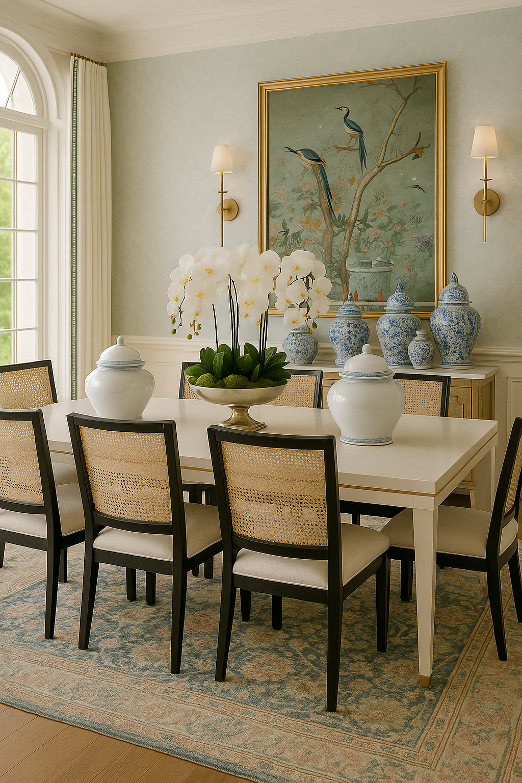 Grandmillennial style celebrates tradition with a youthful twist. Mixing heirloom patterns, chinoiserie, rattan, and classic silhouettes with fresh color palettes and playful details, it brings old-world charm into the present. The result is a look that feels layered, personal, and inviting — equal parts nostalgic and new.
