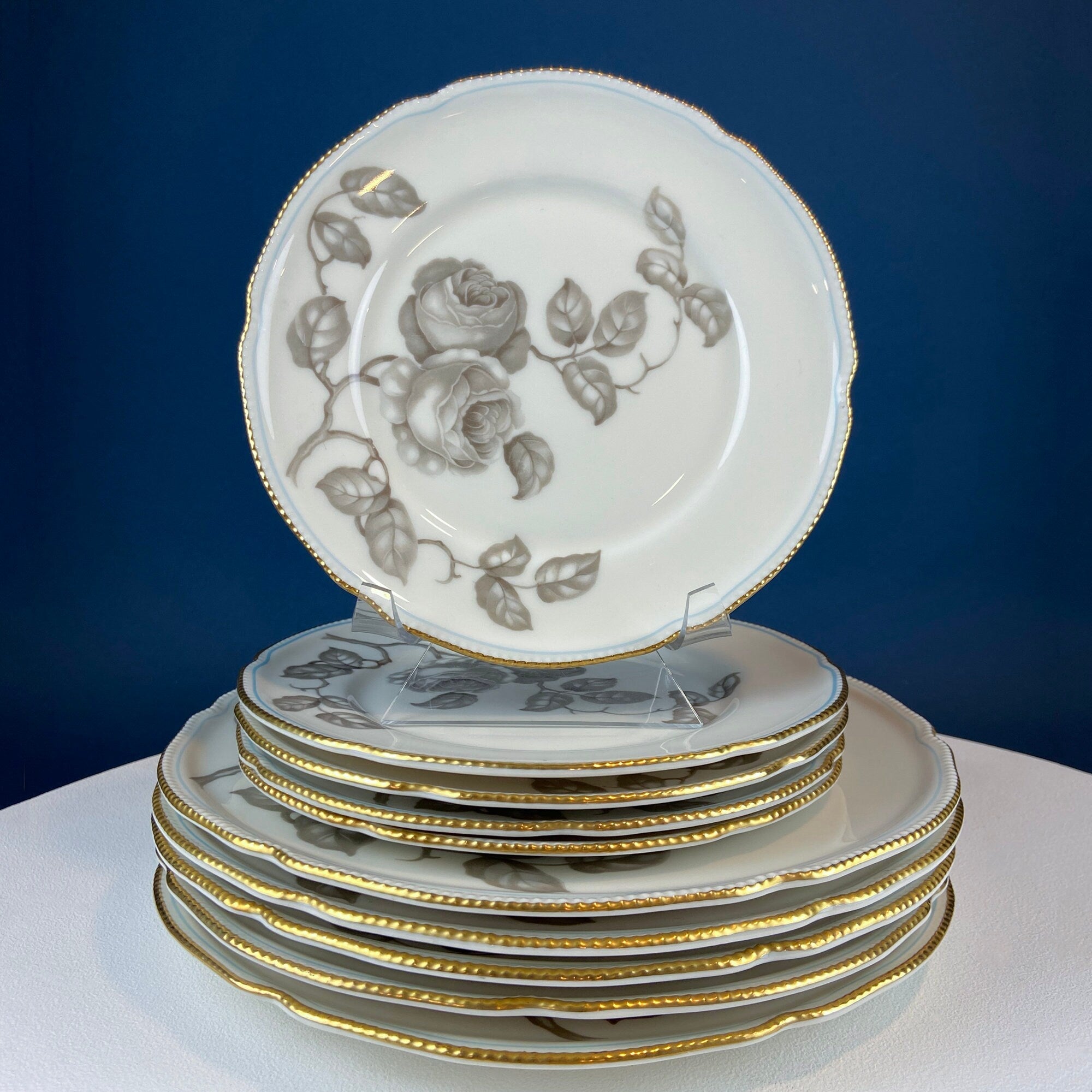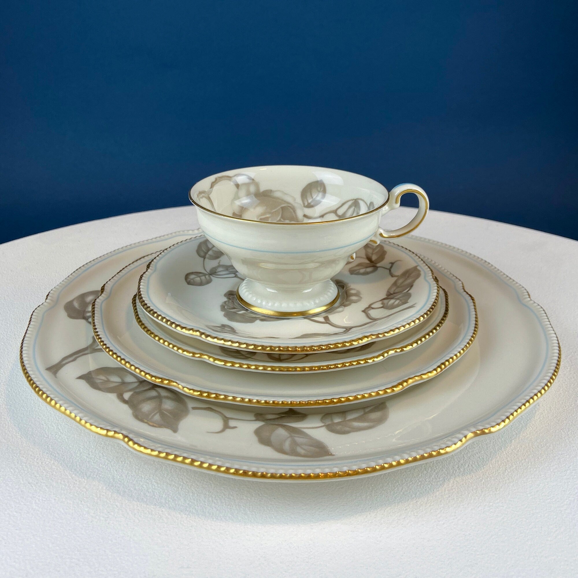 24 Piece Porcelain Dinner Set. Castleton Gloria. Beautiful Neutral Hand Painted Roses. 5 Dinner, Salad, Dessert Plates, Berry Bowls, 4 Cups. Cottagecore Living. Wedding Registry. Excellent Condition. Gold in Like New Condition. Marked by the Manufacturer.