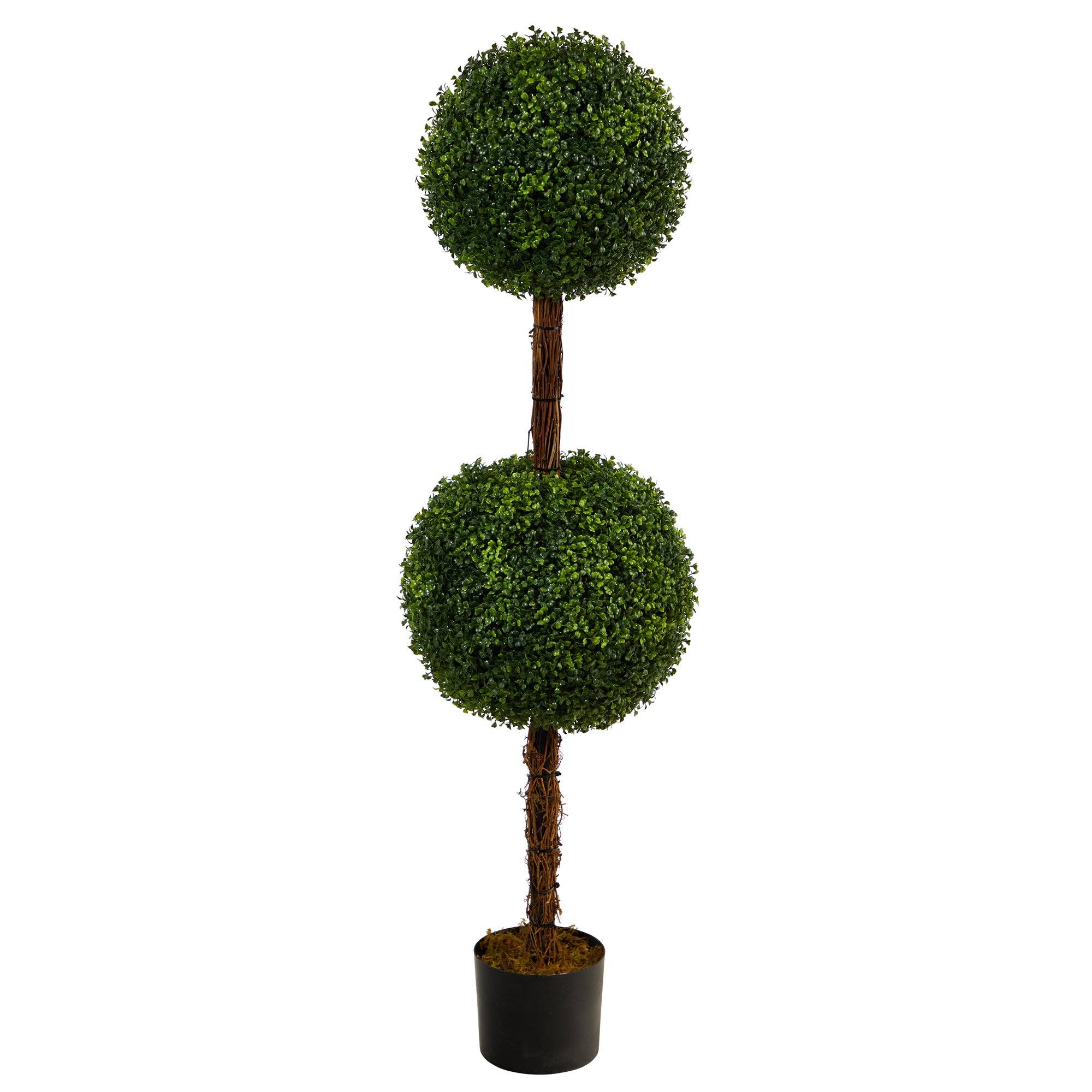 Elegantly greet guests with this double boxwood topiary. One smaller, perfectly trimmed boxwood ball sits above a larger trimmed one made of realistic-looking boxwood foliage. You can now enjoy the sophistication of the boxwood without maintenance or care. Standing 4.5' from a black planter (included in height), curate in compact spaces. Perfect for an apartment, bathroom, room corner, or foyer.
