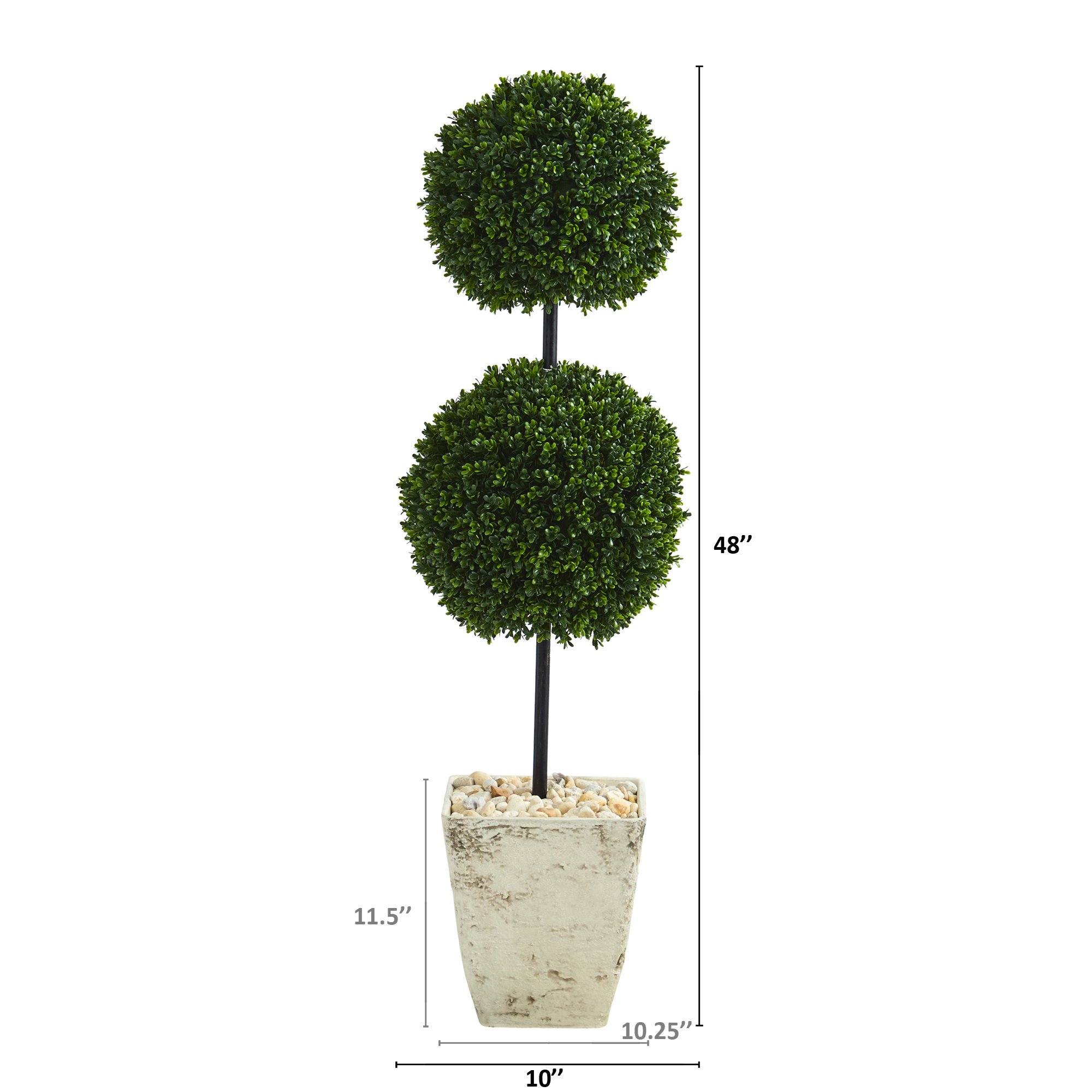 Enjoy the beauty of neatly trimmed greenery with the help of this artificial topiary tree boasting two perfectly manicured bushes made of realistic looking boxwood foliage - all of which is outdoor-safe to withstand the natural elements. Standing 4’ high from a white country planter, this stress-free topiary tree is perfect for accenting the outside entrance to your home or office.