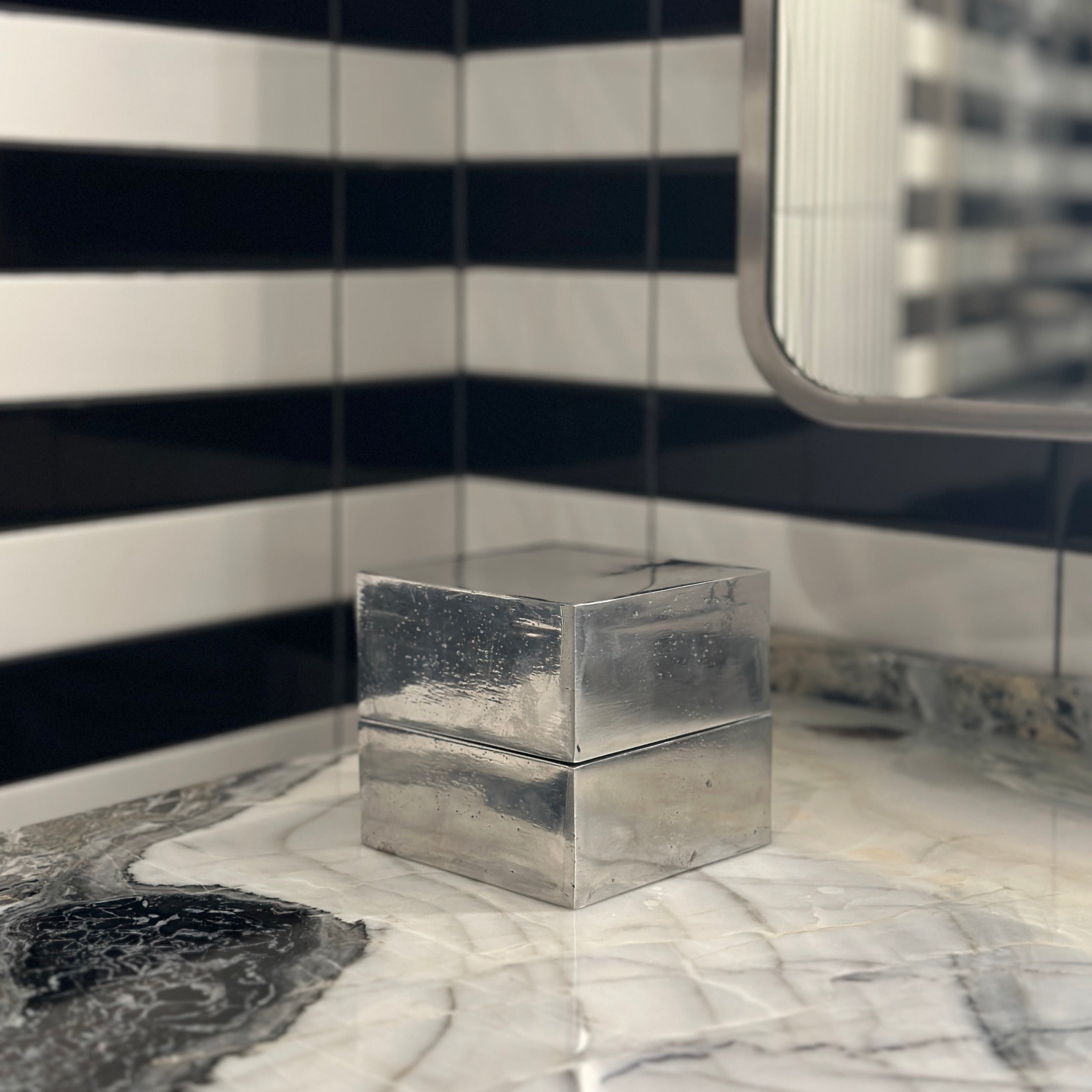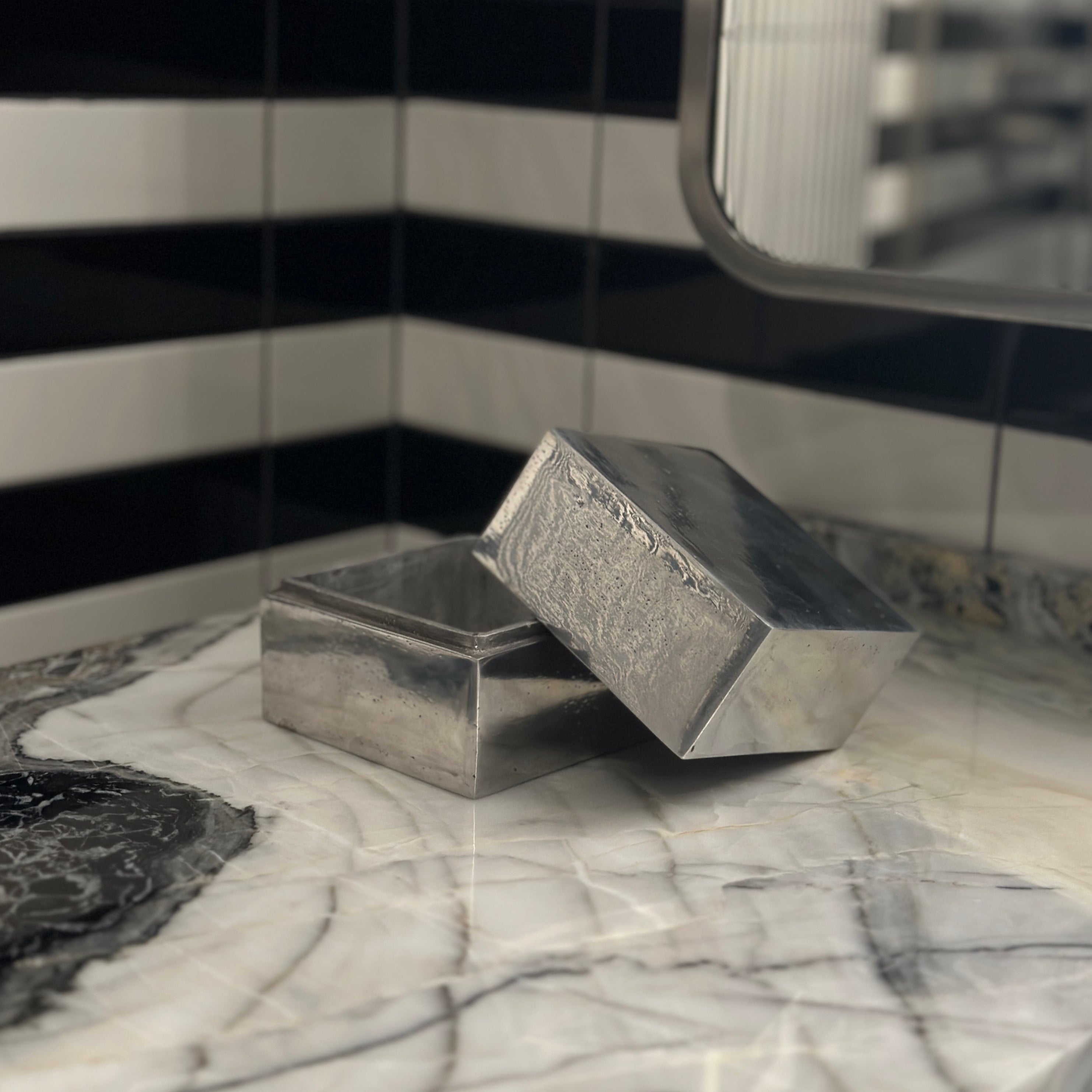 Available in marble, metal, or a considered pairing of both, the 50/50 Box is shaped from enduring materials that invite touch and time. Some are hand-polished to a soft satin sheen, others left to evolve naturally—developing the quiet patina that marks a life well-lived. All share the same balanced proportions.