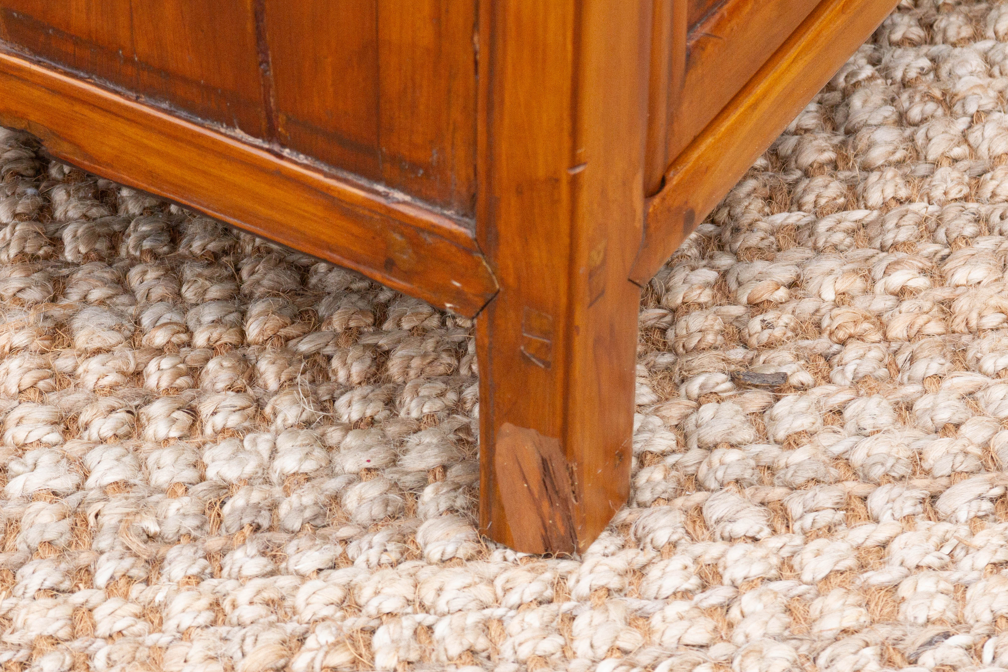 This antique cedar wood buffet cabinet offers a delightful harmony of rustic charm and modern functionality. Crafted with sleek lines that contrast beautifully with its primitive dovetail construction, this rustic cabinet whispers stories of generations past. The warm, honey-brown finish, reminiscent of waxed wood, adds to its inviting character. Beyond its undeniable charm, this versatile cabinet offers practicality. Two functional drawers sit nestled above two doors that open to reveal an interior shelf, providing ample storage space for your belongings. The passage of time has endowed the cabinet with a few minor cracks, a natural consequence of the wood's contraction. These imperfections, however, add to its unique character and authenticity.