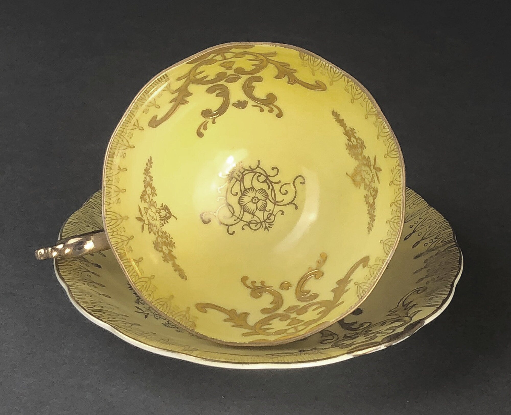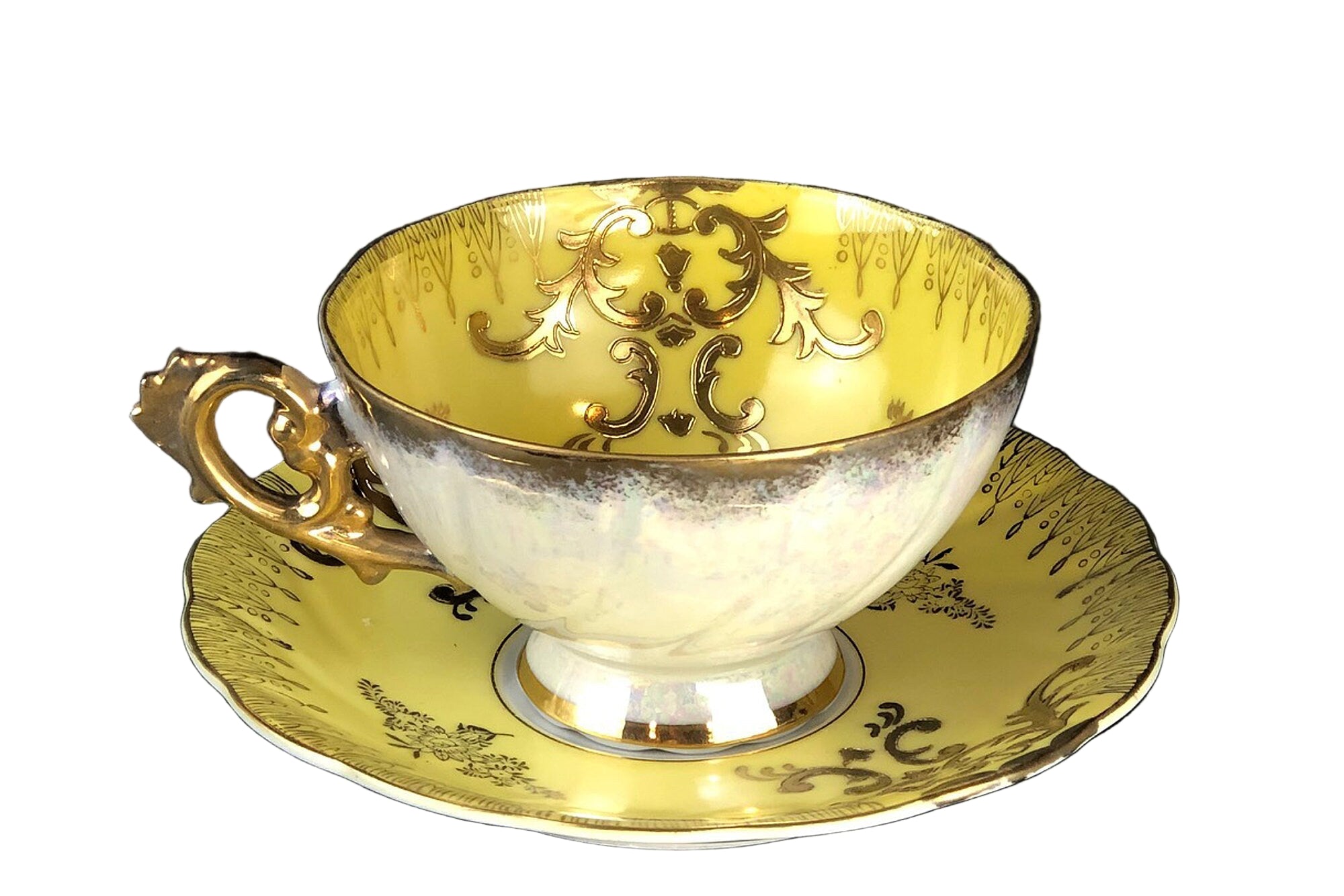 Antique Cup and Saucer Set by Royal Sealy China, Japan. Yellow Cup and Saucer with Rich Gold Decor and Iridescent Background Outside. Marked by the manufacturer. Excellent condition. No damages of any kind. Perfect gift idea for vintage items lovers.