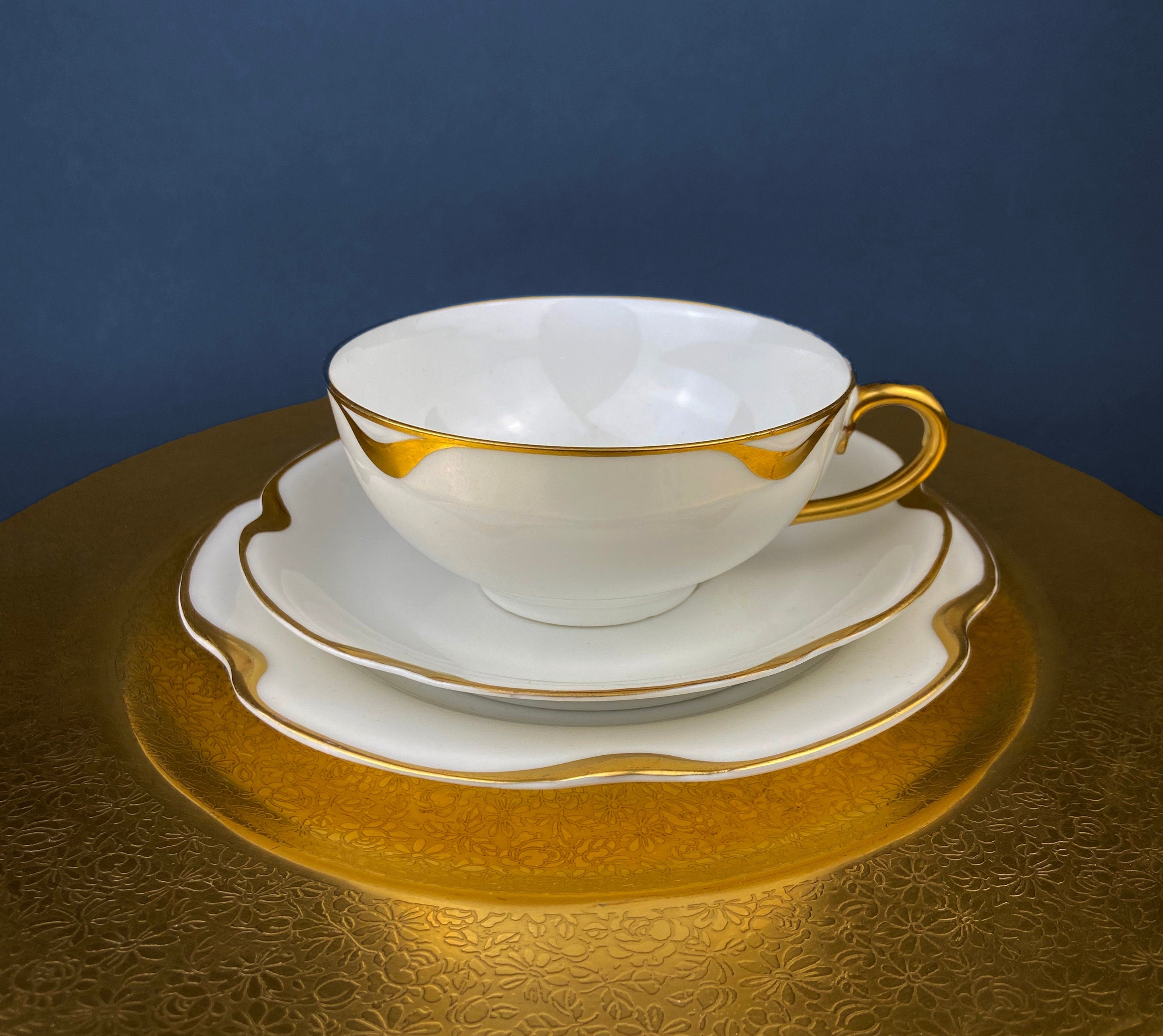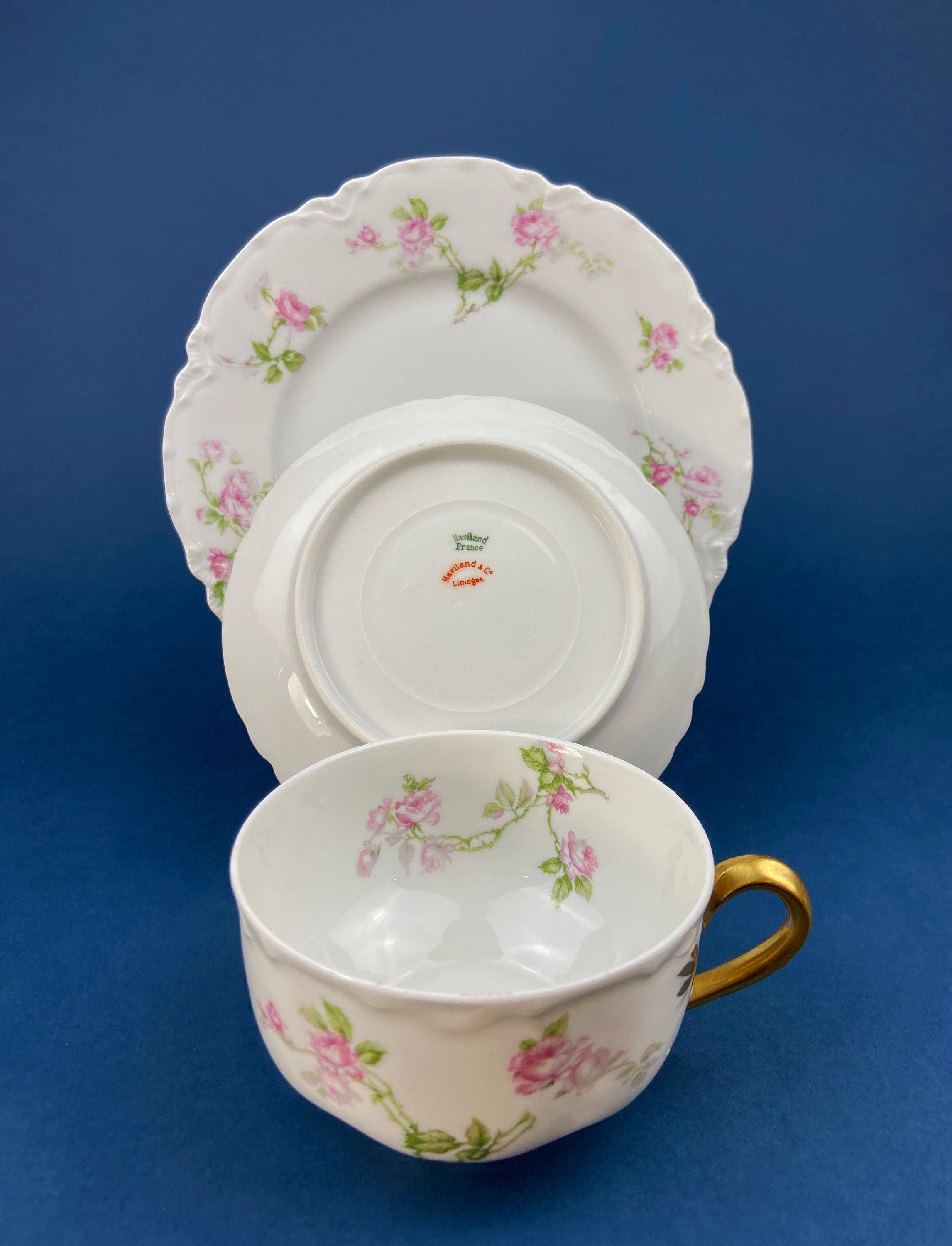 Limoges Trio. Tea Cup, Saucer, and 7.5" Dessert Plate. Hand-Painted Porcelain by Haviland, France. Delicate Roses Motif. Highly Collectible. Excellent Condition. Marked by Manufacturer.