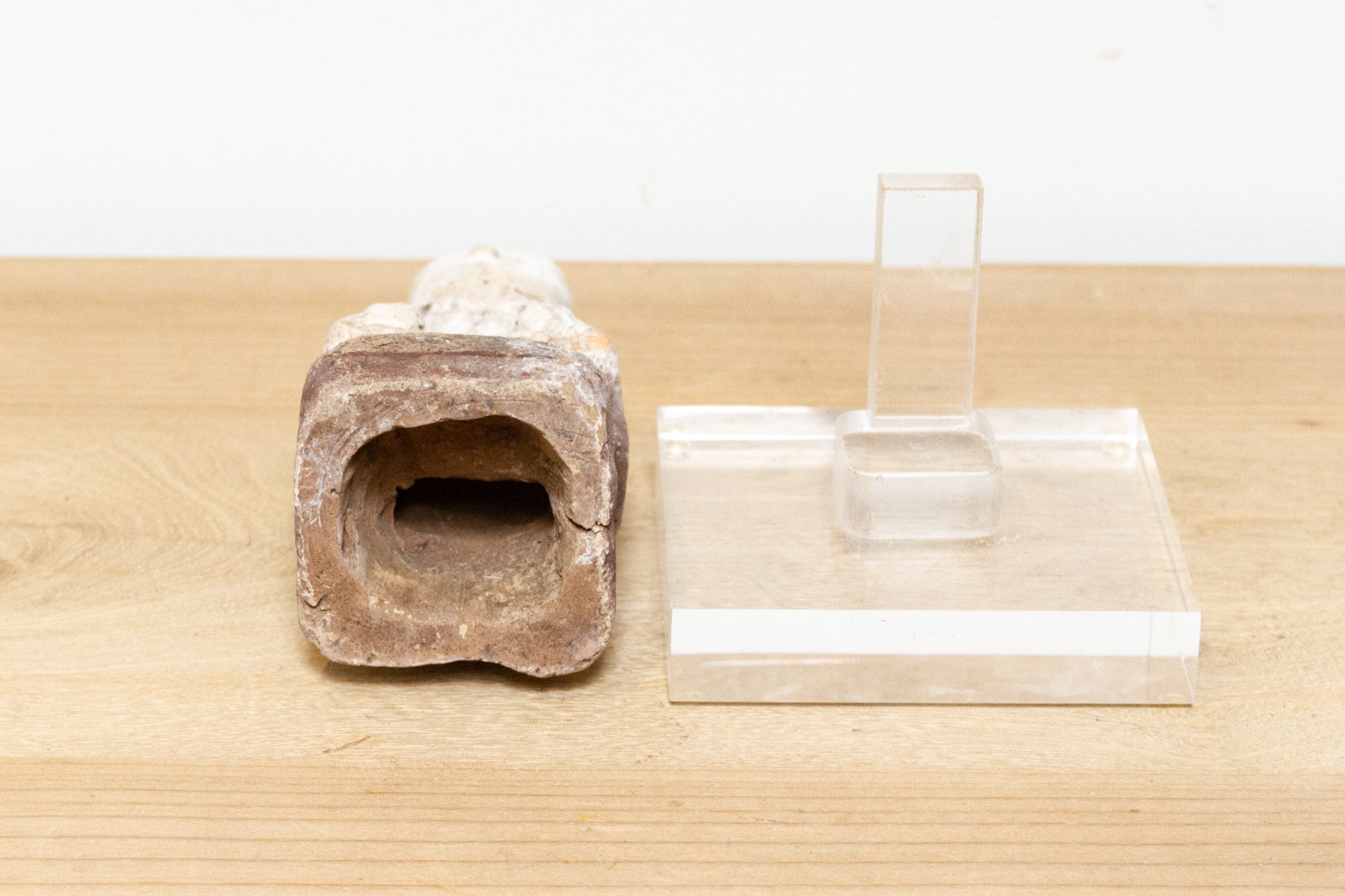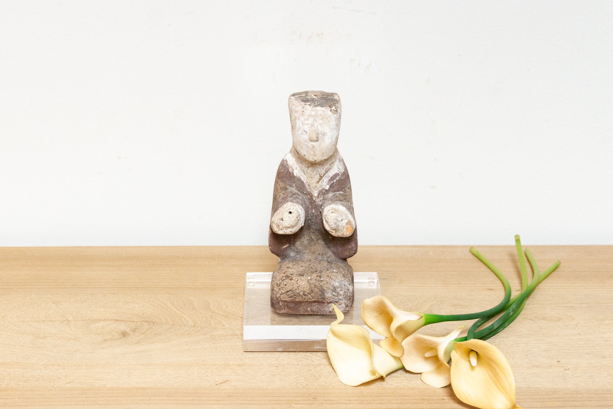 Mounted on a custom plexiglass stand for display, this terracotta attendant figure serves as a captivating piece of art and a testament to the enduring beauty of Chinese cultural heritage. Please note, this statue shows age and minor imperfections, refer to pictures.