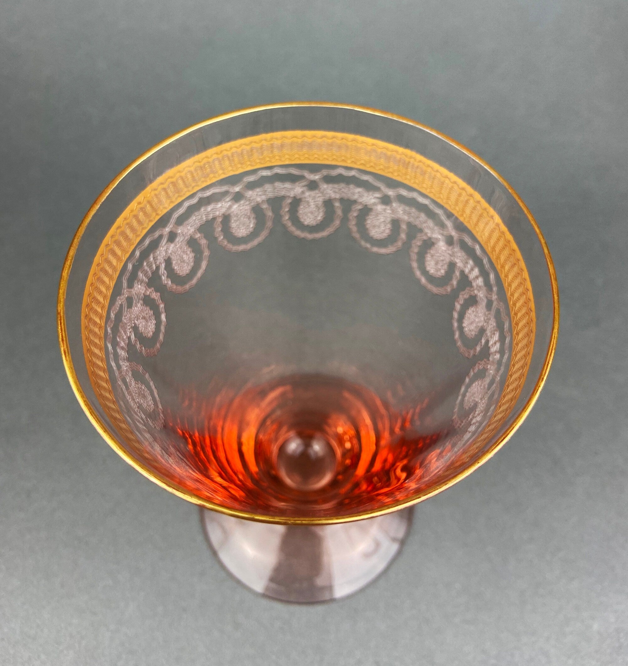 Antique Pink Crystal Water/Juice Goblets. Morgantown Etched "Necklace Pink Gold" Pattern. Set of Eight 8oz Footed Tumblers. Replacements. Very Good Vintage Condition. No visible gold loss.