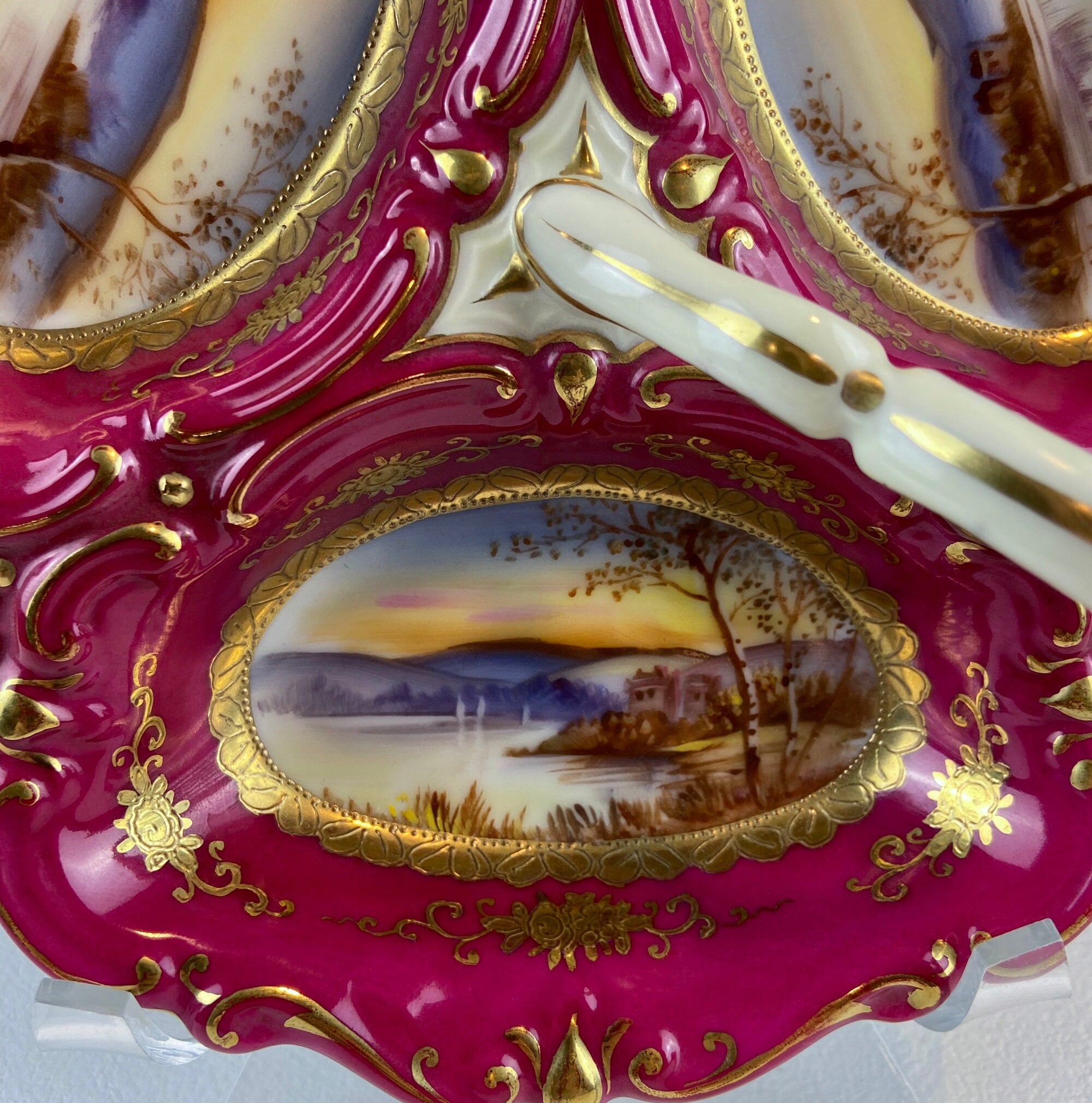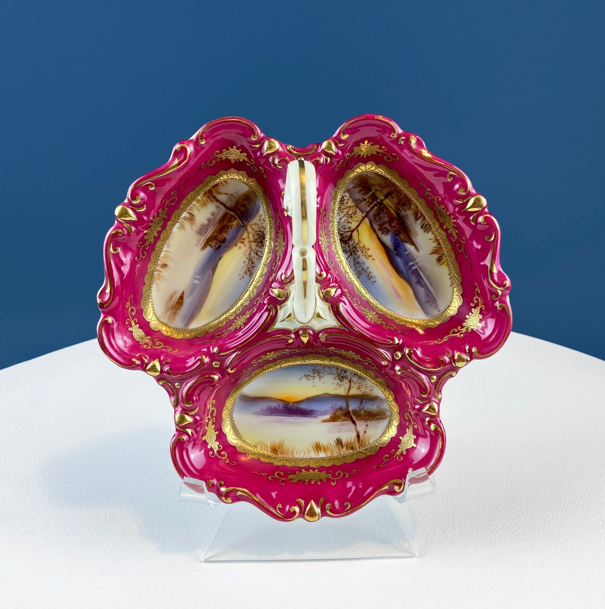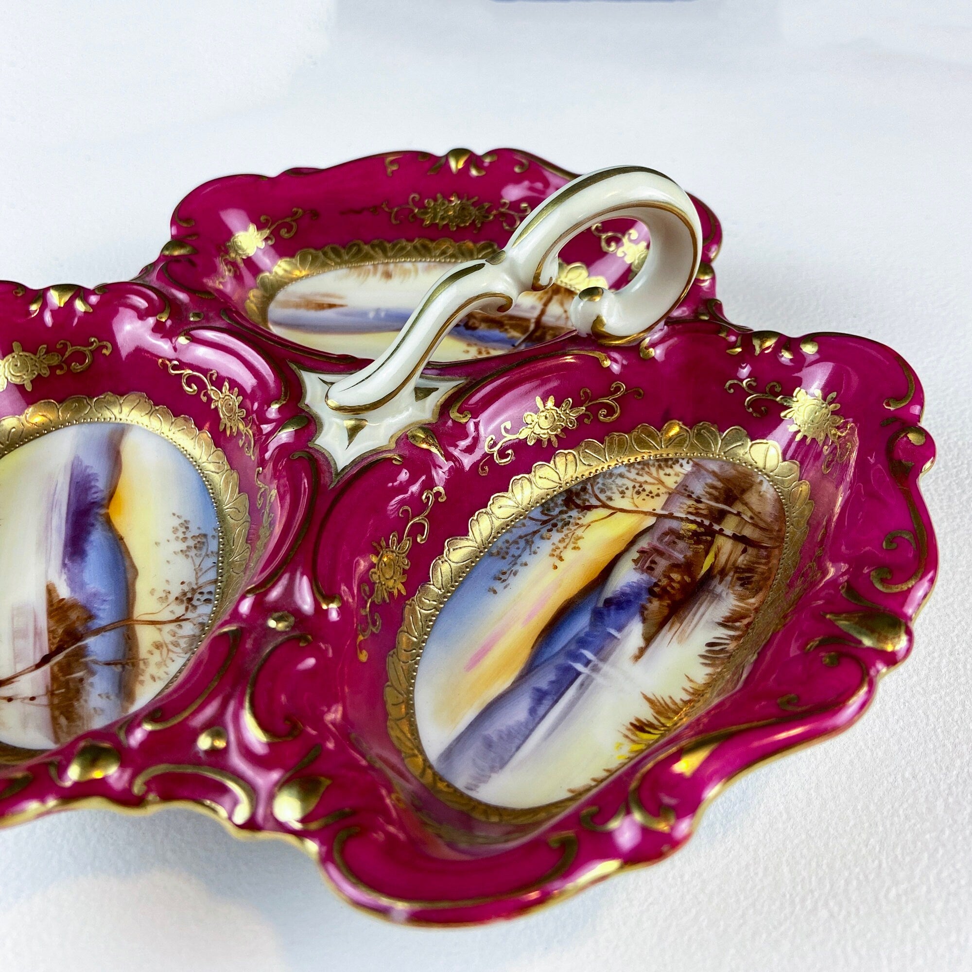 Antique 3 Part Porcelain Serving Dish. Stunning 3 Different Hand Painted Landscapes. Rare Collectible Art Dish. Divided Bowl with Handle. Home Gift. Excellent Condition. Not Marked by the Manufacturer. Most Likely, Either French or Bavarian.