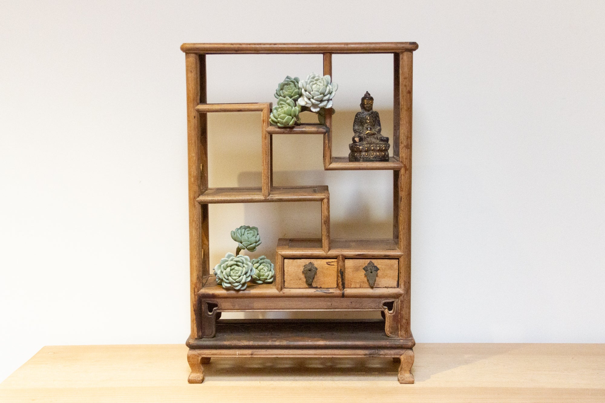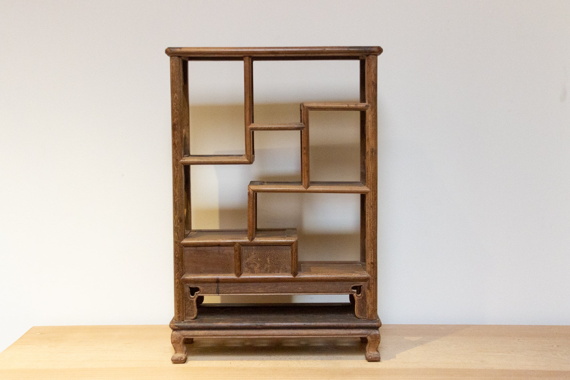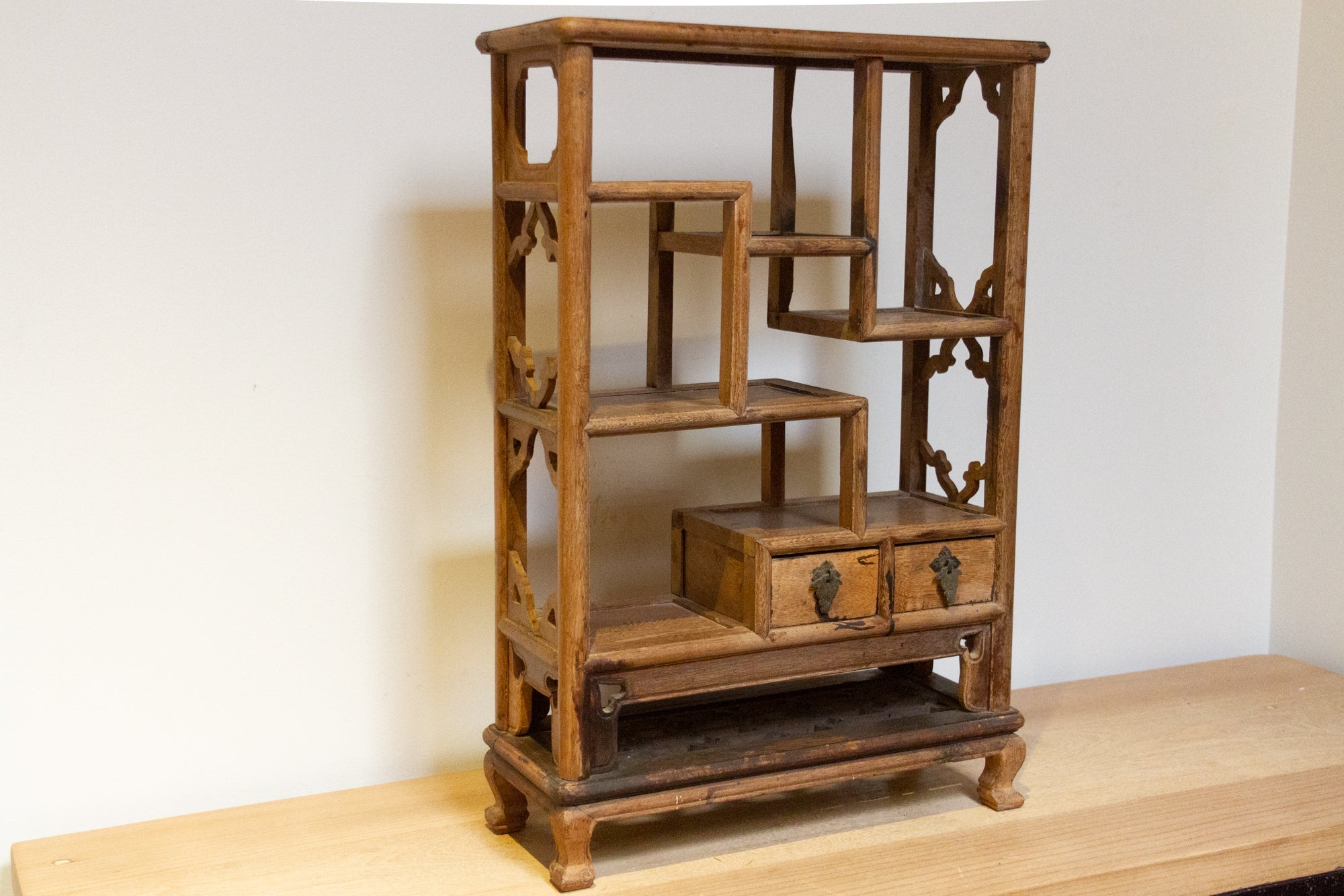 Antique Chinese Ming cabinet. Crafted from hardwood, this exquisite display cabinet features the distinctive Ming style, characterized by its gracefully shaped legs. The cabinet is adorned with two small drawers, offering practical storage, while multiple small shelves provide a showcase for your cherished items. With meticulous craftsmanship, this antique table-top cabinet reflects the Ming dynasty's aesthetic influence. The warm tones of the hardwood and the Ming-style legs contribute to its historical charm.