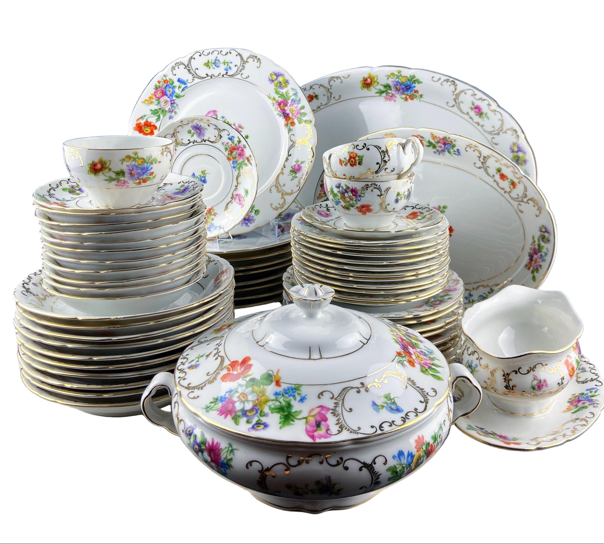 Antique Victoria Czechoslovakia 56 Piece Dish Set. French Country Living. Modern Country. Dining Room Table Decor. 10 Dinner Plates, 8 Salad Plates, 11 Dessert Plates, 10 Berry or Dessert Bowls, 10 Soup Plates, 3 Cups and Saucers, Sauce or Chocolate Boat with Plate, 2 Serving Platters, Soup Tureen. Gift for Him or Her. Wedding Registry. Excellent Condition. Marked by the Manufacturer.