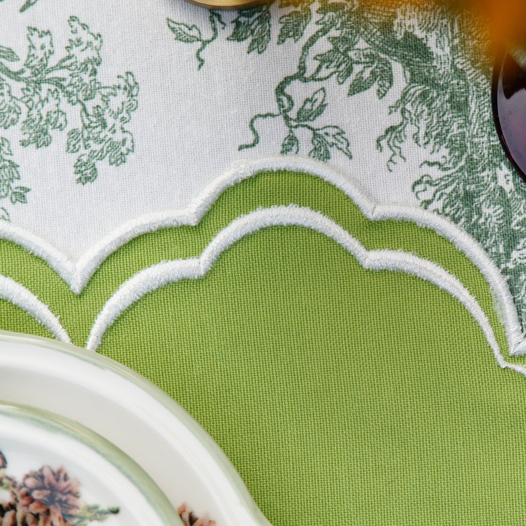 Brighten your table with the delightful Aquelle Placemat. Crafted from a premium cotton blend and delicately finished with blue wavy scalloped embroidery, this design adds a touch of classic elegance to any gathering. Perfect for everyday meals or special occasions.