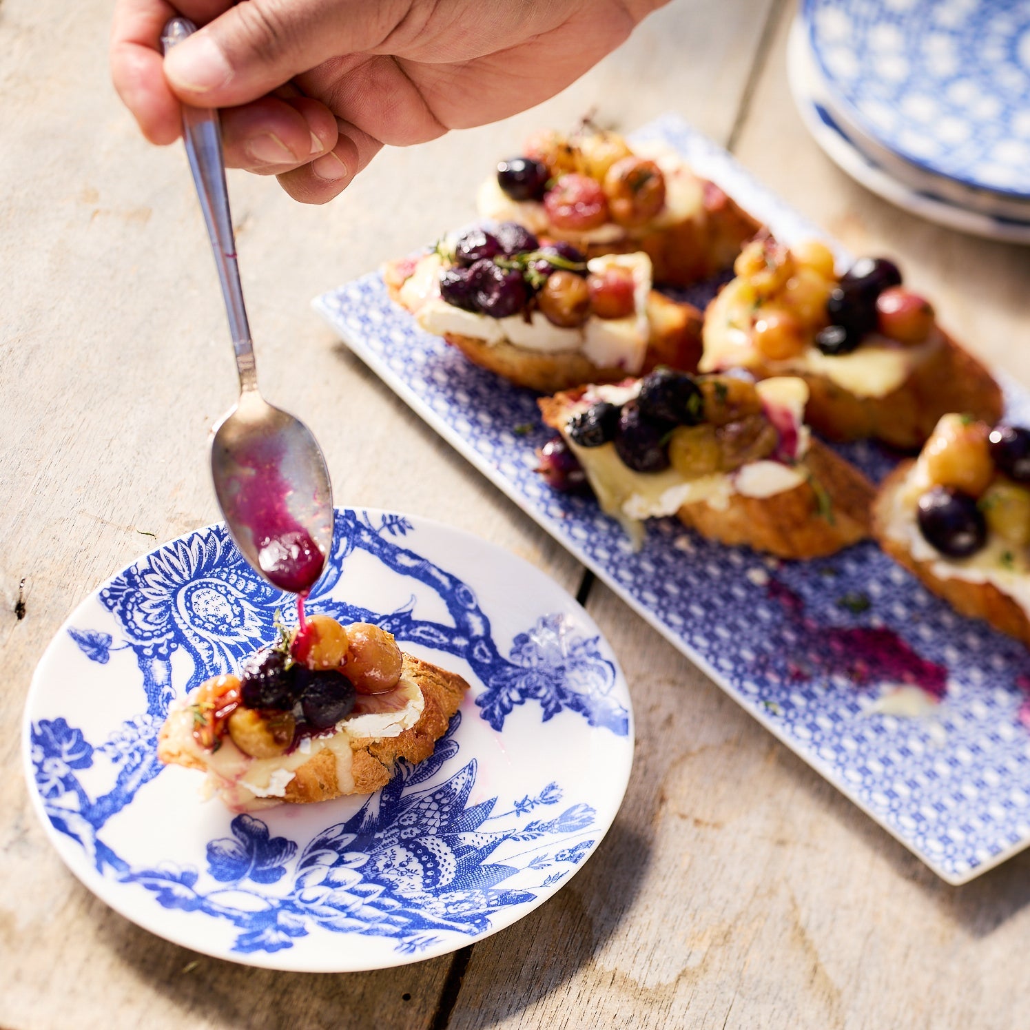 These small plates are an entertaining powerhouse, ready to plate up bread, appetizers, dessert, or whatever you’re serving with their bold pattern plucked from an ancient tapestry on heirloom-quality dinnerware.