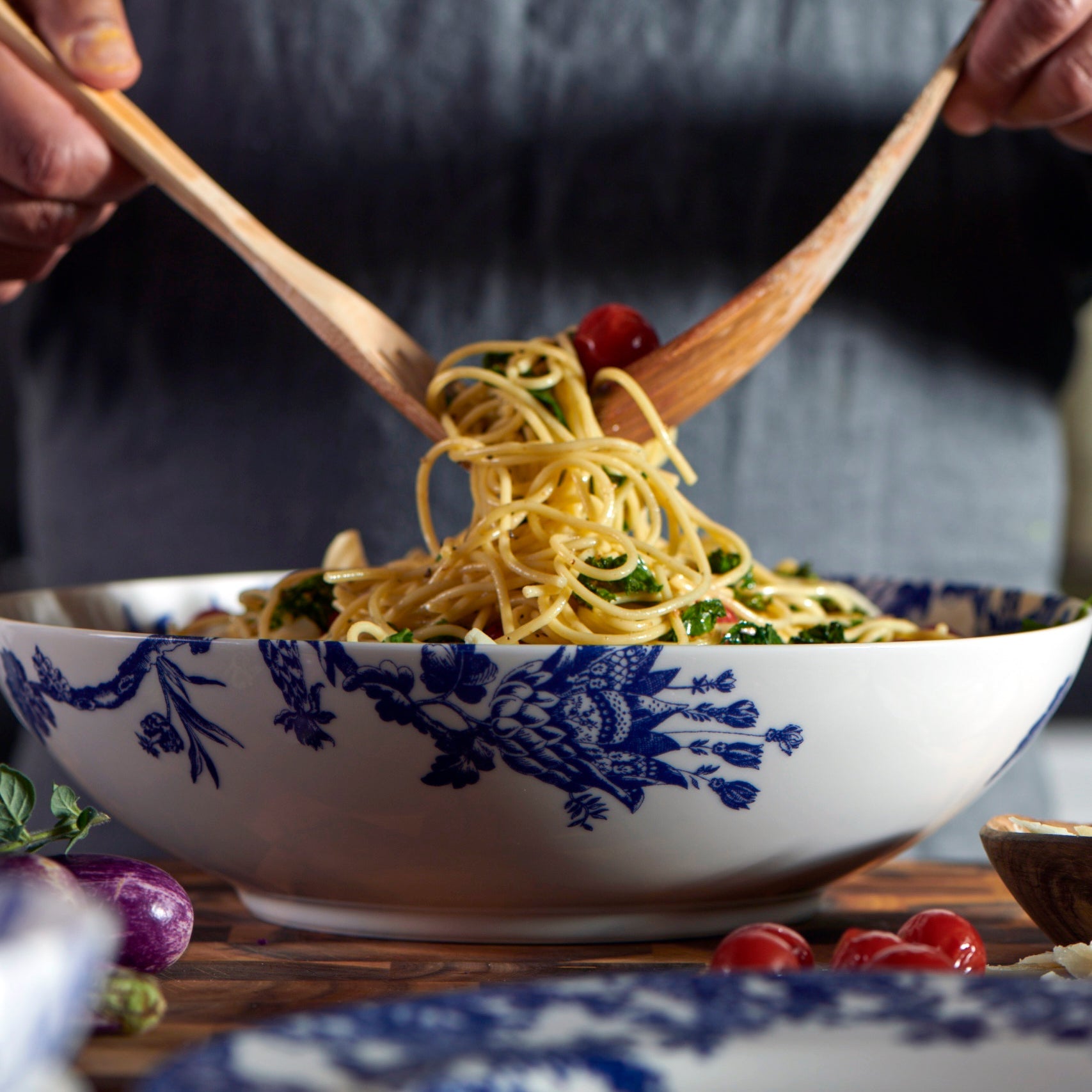 This large serving bowl makes a bold statement with unexpected composition and graphic florals.
