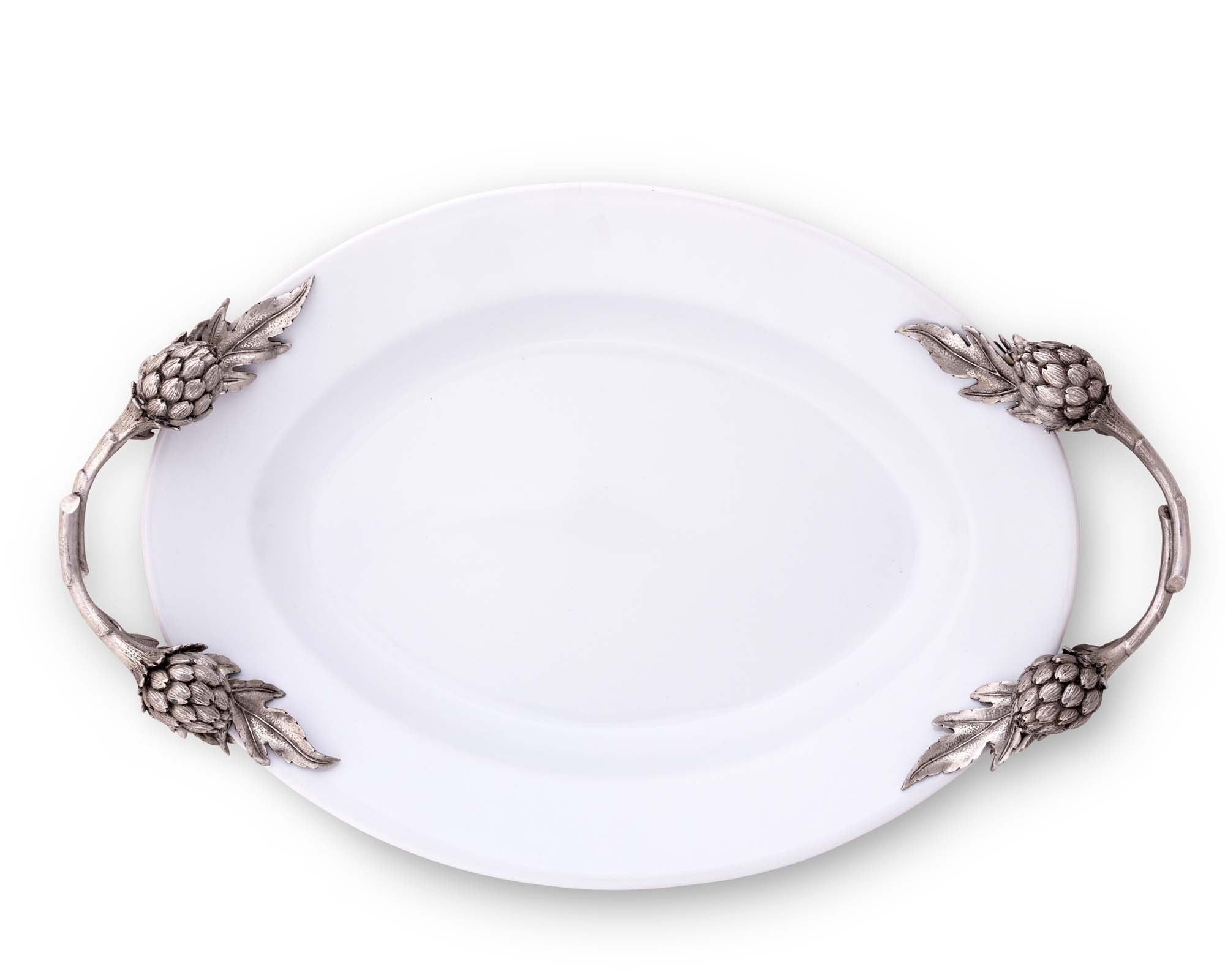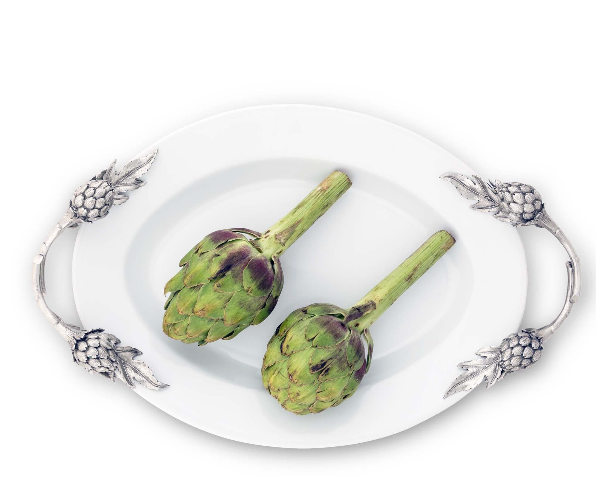 Enhance your entertaining experience with Vagabond House's Artichoke Stoneware Serving Tray. Hand-cast pewter artichoke handles add a touch of elegance to this generously sized tray, perfect for serving side dishes or salads. The lustrous fine stoneware is double-glazed and twice-fired, resulting in a striking white finish that brings refinement to any table setup. This premium tray makes the best gift for women who love to serve generous portions at dinner parties, and those who appreciate artichoke-themed serveware. Experience unprecedented quality and craftsmanship with this tray from our Farmer's Market collection.