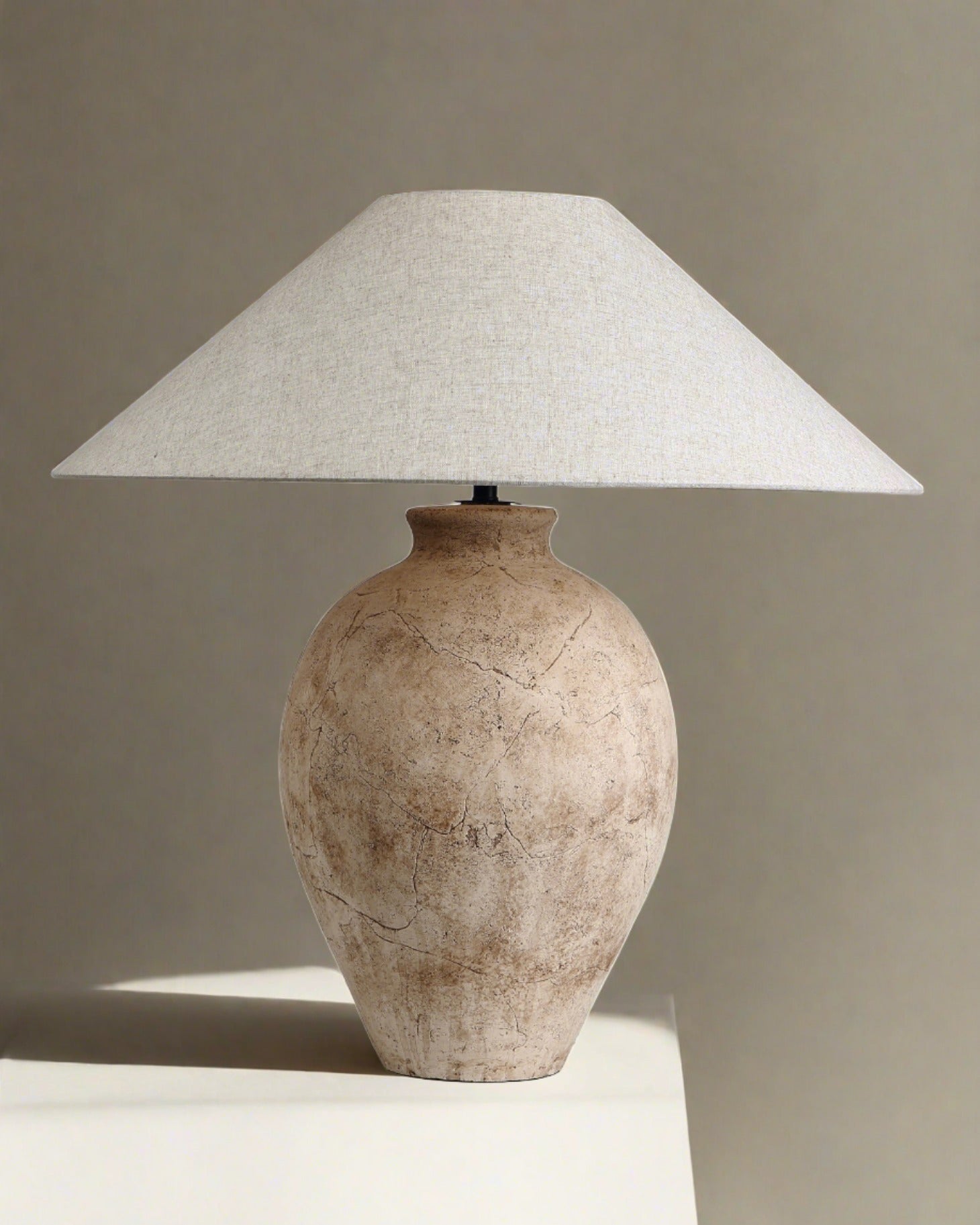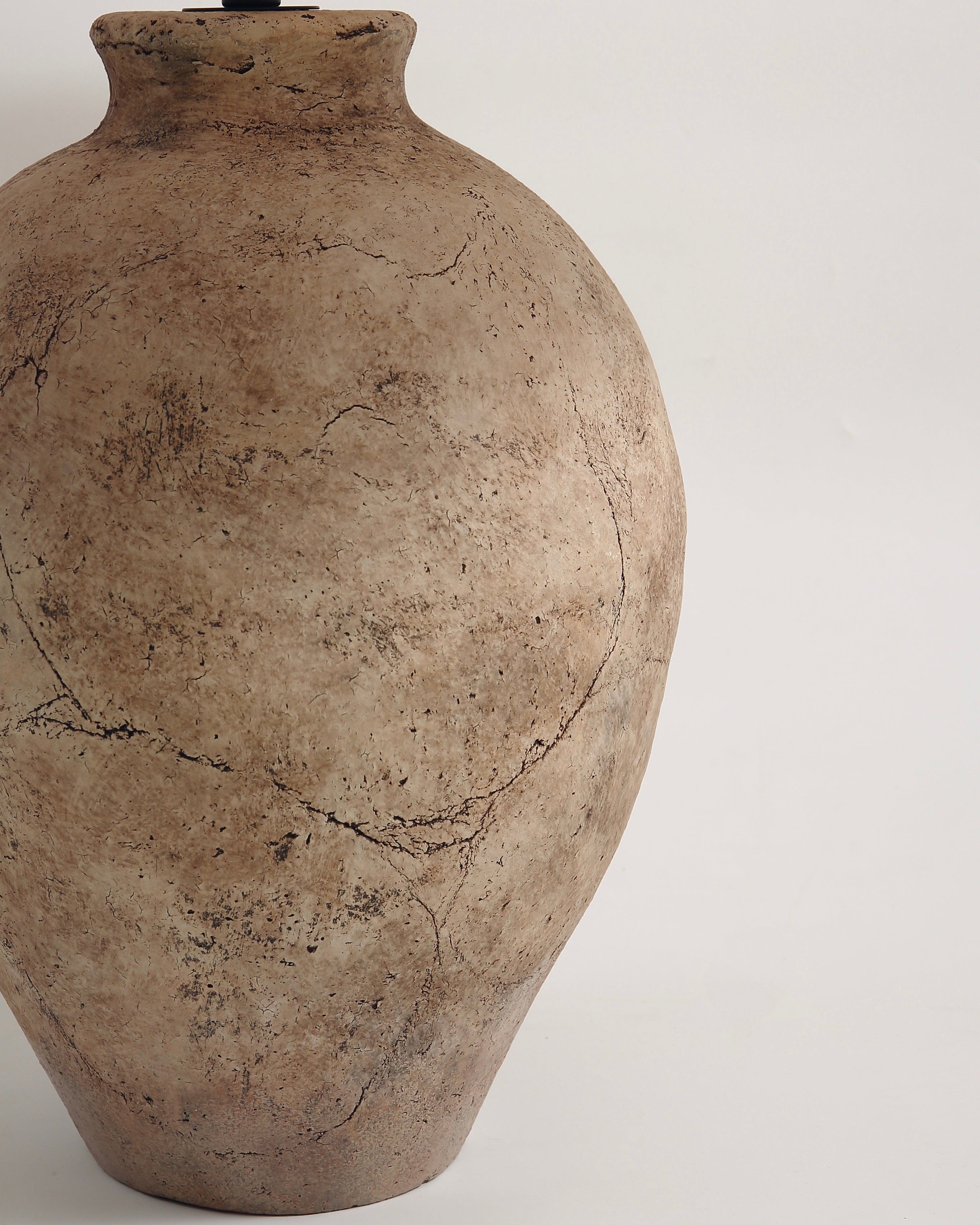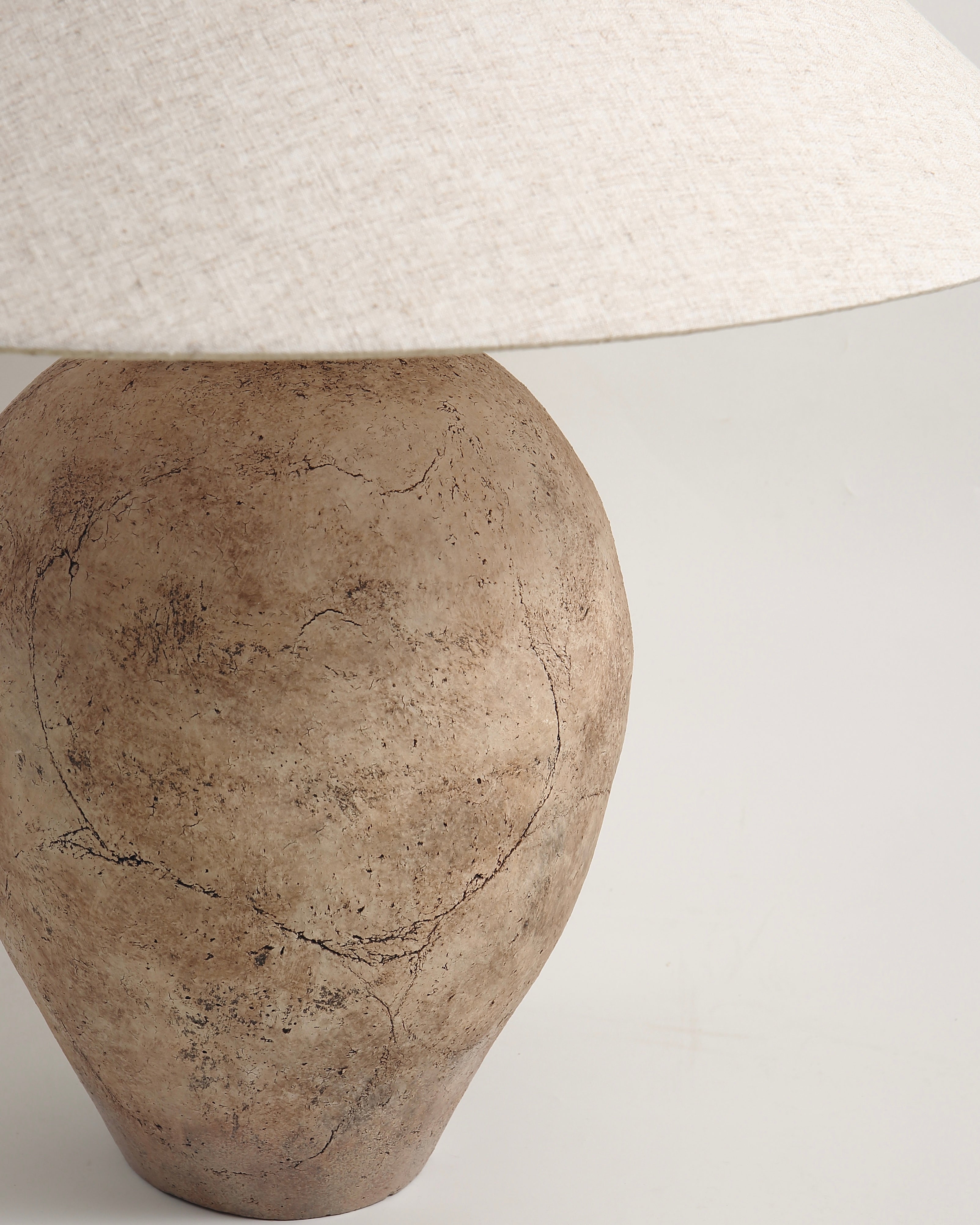 The Avianna Lamp exudes a neutral tan hue with subtle brown accents provides a serene backdrop, while intricate crack detailing embedded in the paint and texture of the vase adds depth and character.