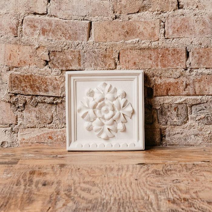 The House Parts collection of botanical plaques replicate designs from a 19th Century oak-paneled room. Each wood panel was capped with a different botanical design.