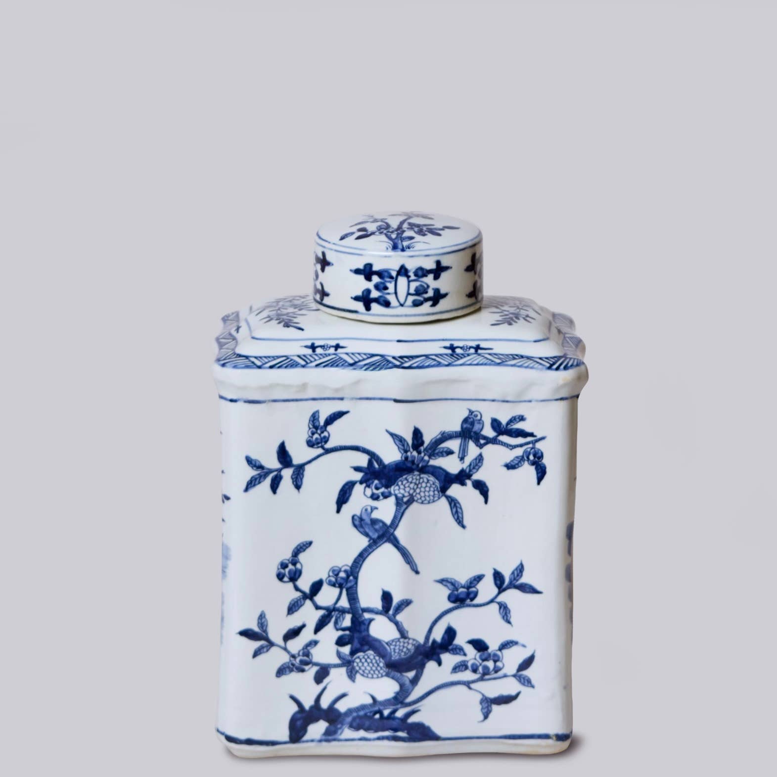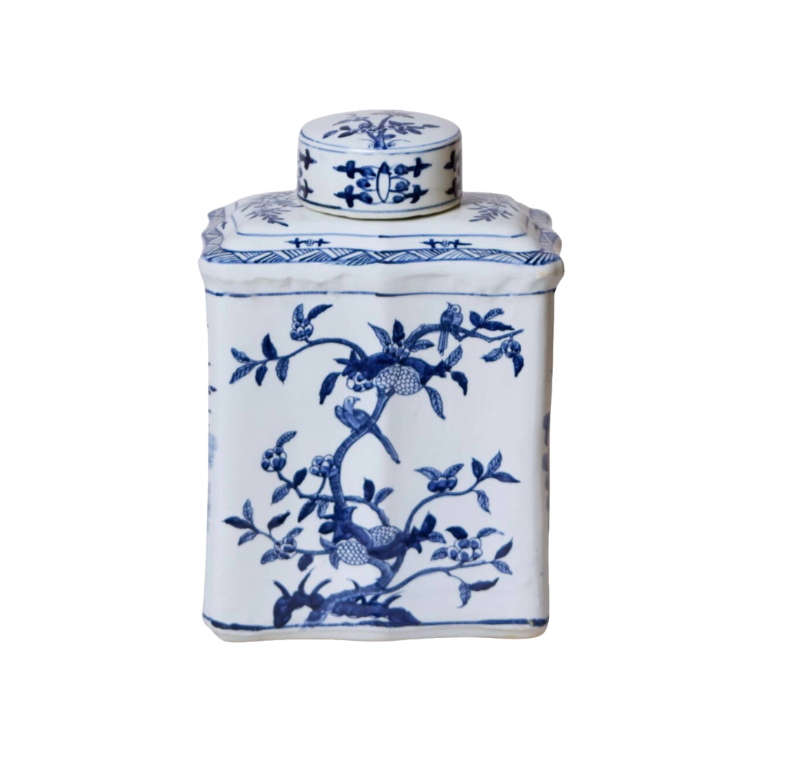 Inspired by late Qing dynasty design, the Bird and Flower Blue & White Porcelain Caddy features delicate avian and floral motifs rendered in classic cobalt blue. This elegant canister-style jar captures the timeless appeal of traditional Chinese porcelain and makes a refined statement in any setting.