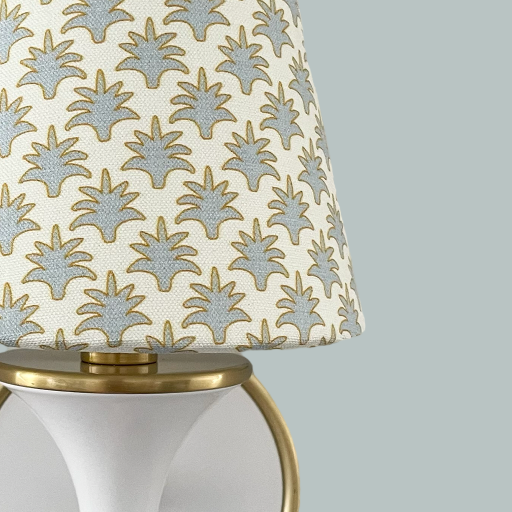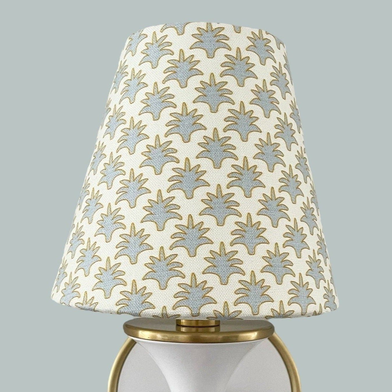 Elevate your decor with our handcrafted clip shade, featuring the go-with-anything Whitney fabric by artist Danika Herrick. This beautiful, hand-drawn blue, gold and beige pattern, on a small empire lampshade, is perfect for chandeliers and sconces.