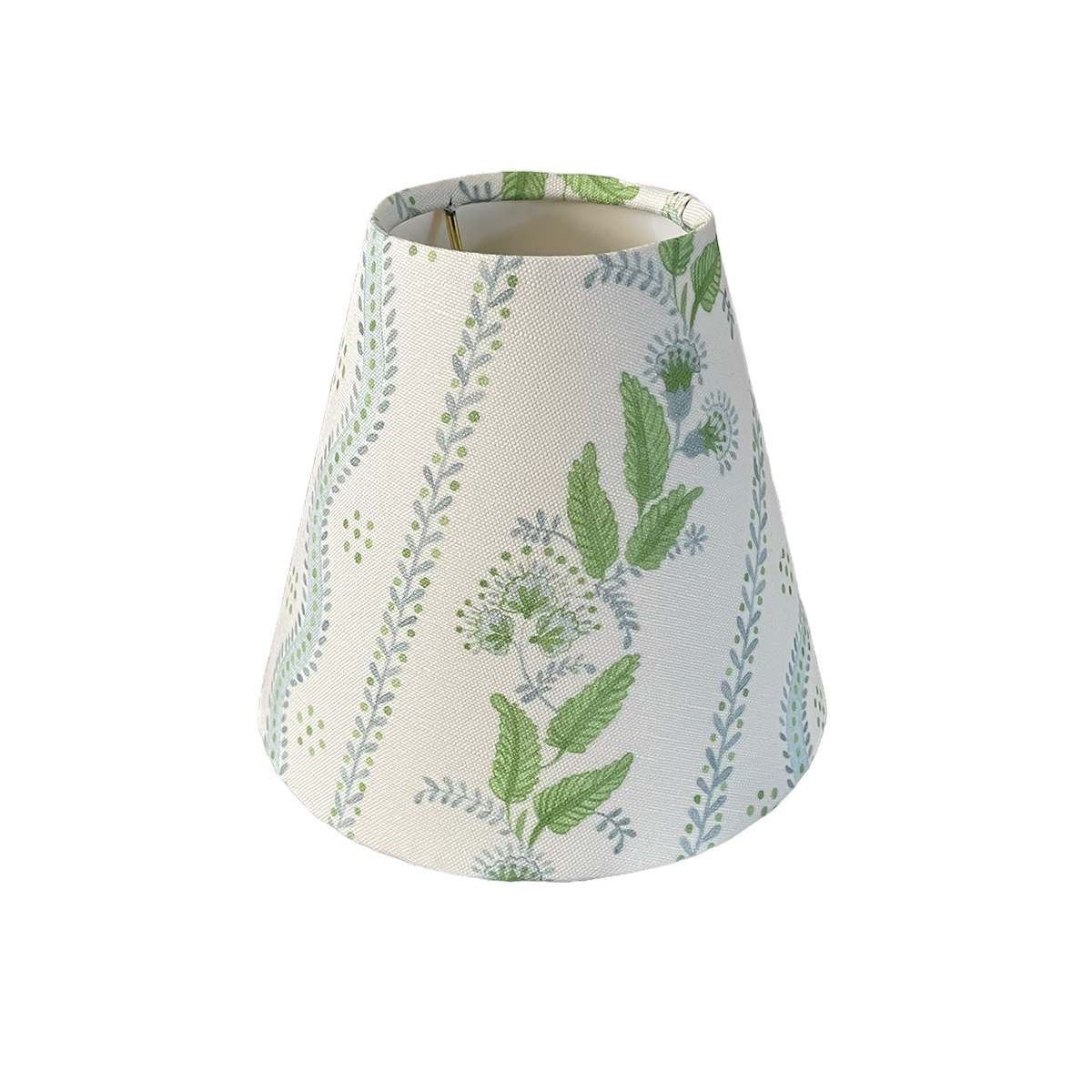 Elevate your decor with our handcrafted clip shade, featuring the popular Emma Stripe fabric designed by artist Danika Herrick. This beautiful, blue and white floral pattern with striped detailing, on a small lampshade, is perfect for chandeliers and sconces.