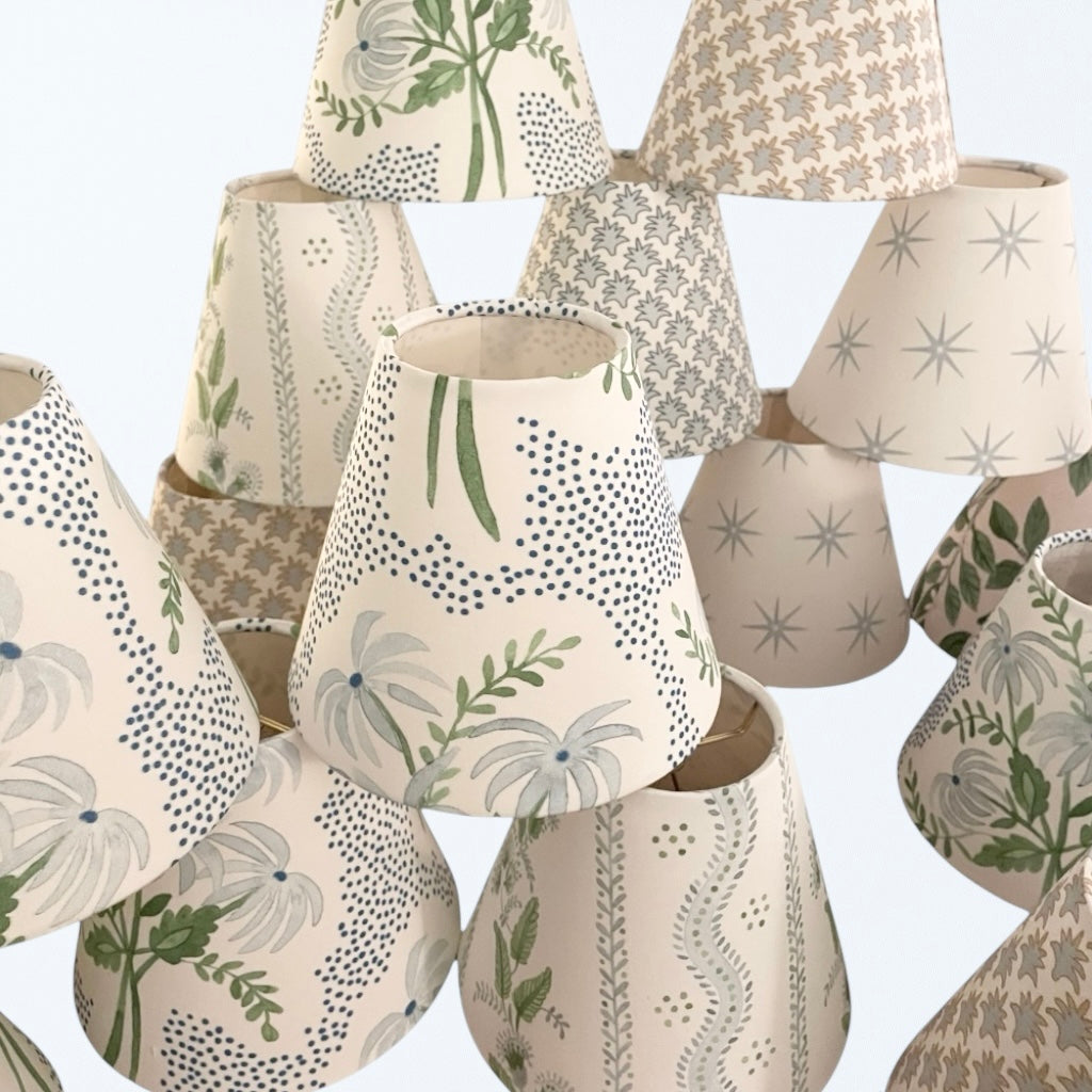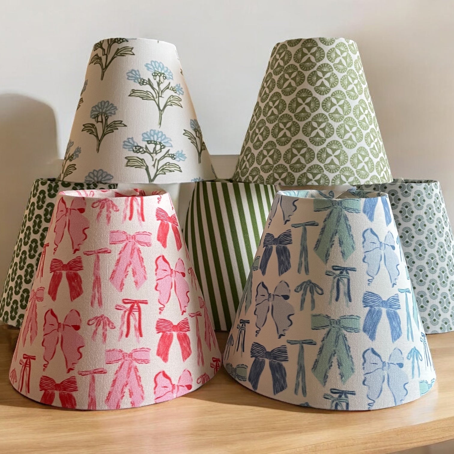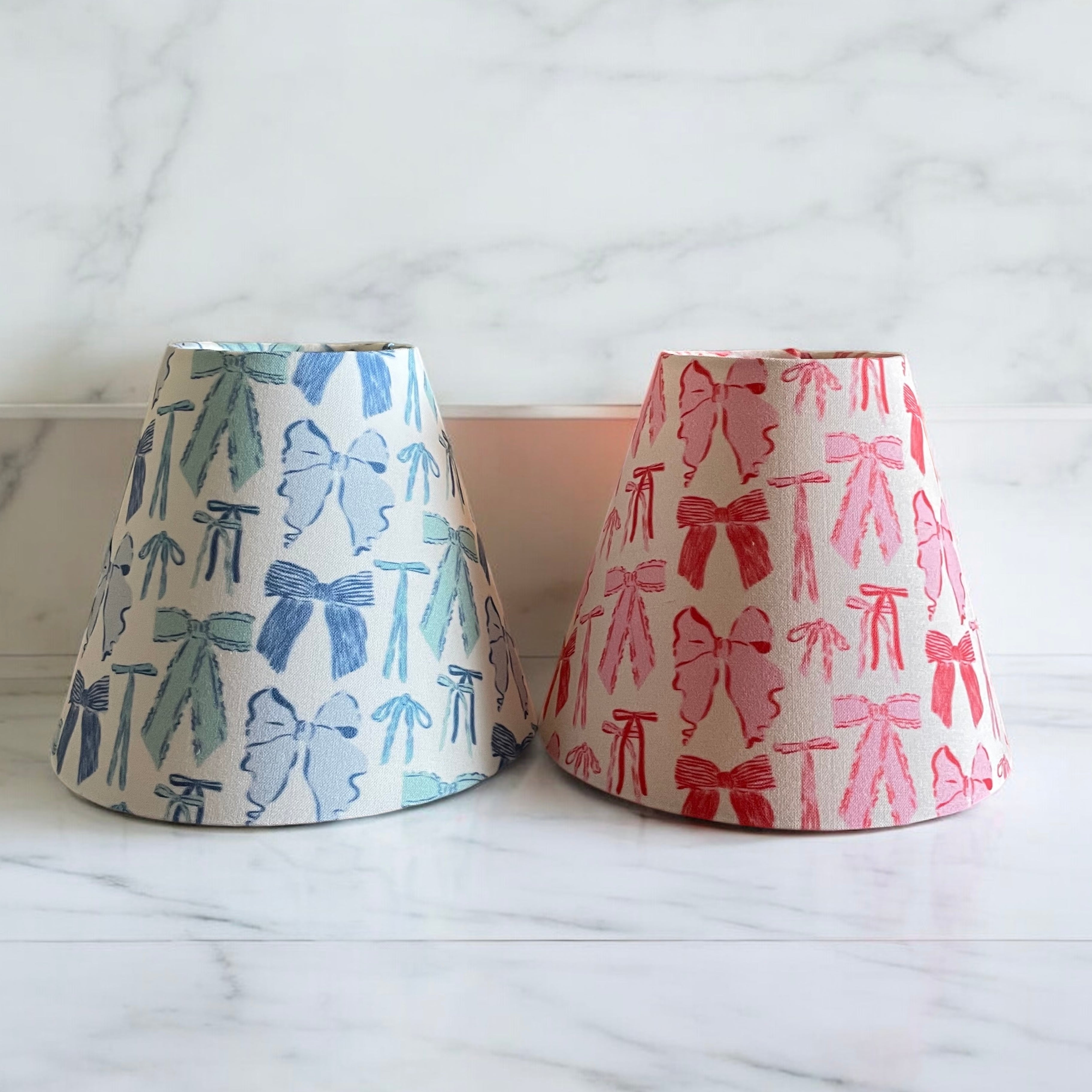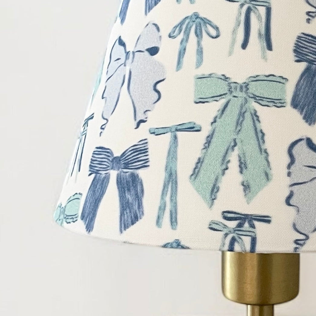 Liven up your lighting with our handcrafted clip shade, featuring this sweet bow print print by artist Krissy Mast. This charming pattern, features hand-painted blue bows and ribbons on a white background.
