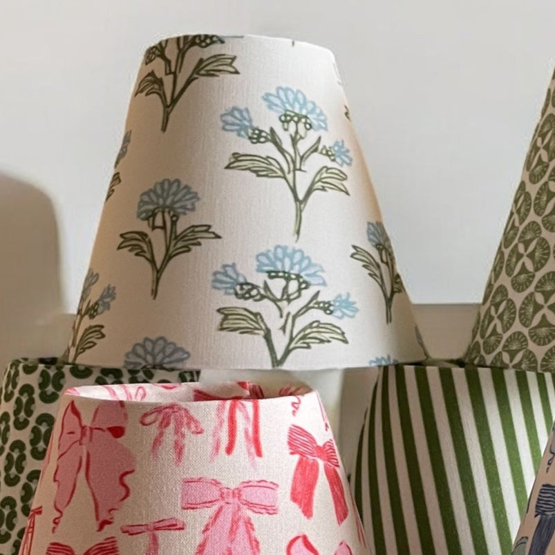 Add charm and style to your light fixtures with our handcrafted clip-on sconce shades, featuring this sweet blue and green floral design by artist Whitney English. The lampshade easily clips onto chandeliers and sconces.