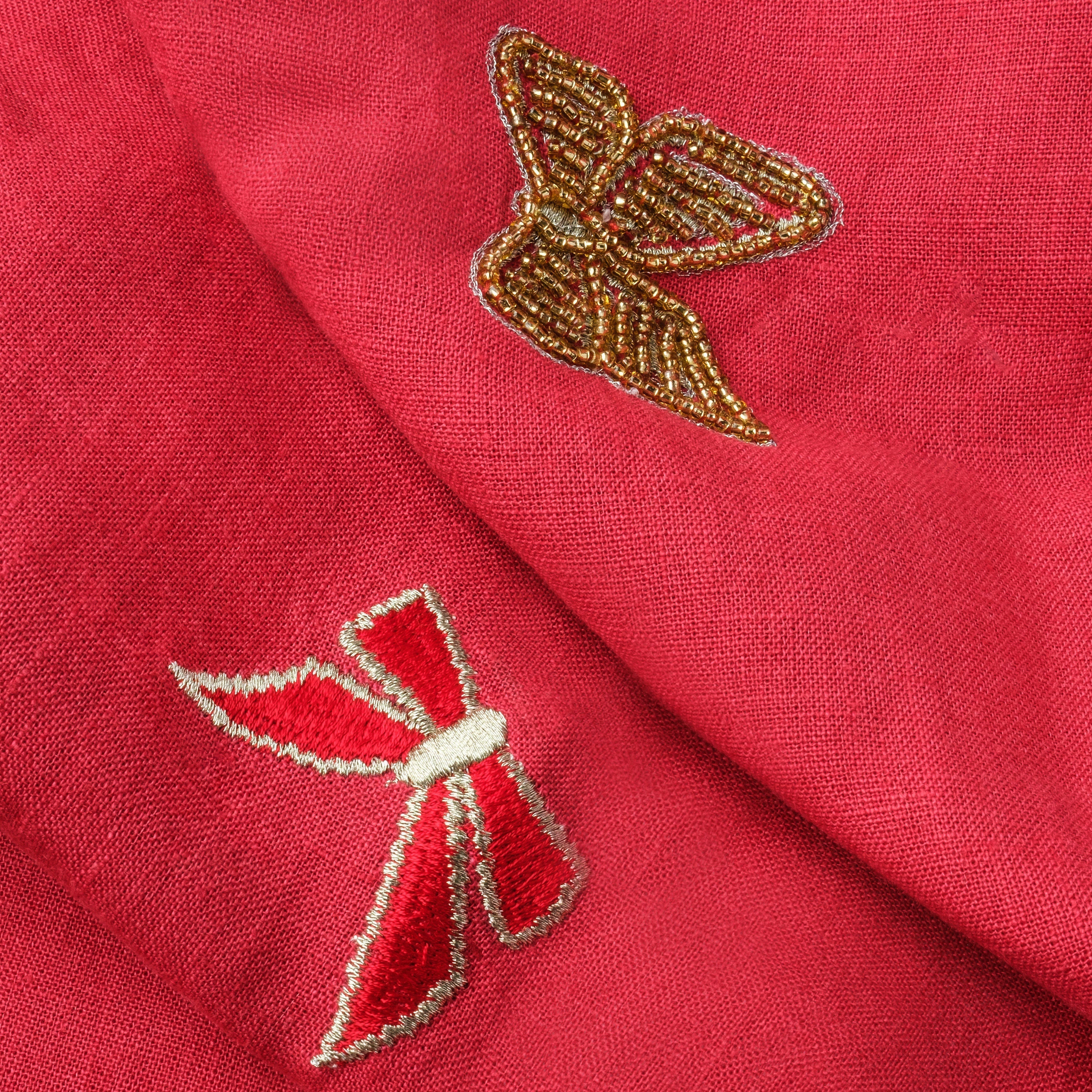 What could be more festive than a rich red table runner adorned with bows? Adding even more bows, of course! Designed to coordinate perfectly with our red enamel bow placecard holders and bow napkin rings, this standout runner sets the stage for a truly show-stopping holiday table. Its bold berry hue and shimmering bow details make it the centerpiece of the season.