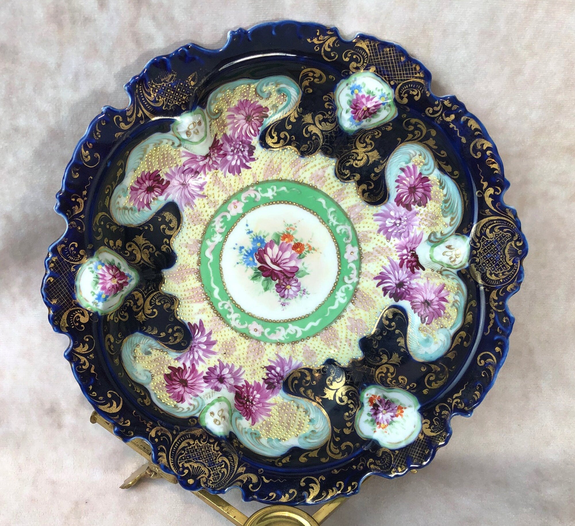 Antique Bowl with Stand. Intricate Hand Decorated Large Dish with Scalloped Rim and 22 Karat Gold Decor. Unique rare finding. It is not marked by manufacturer.