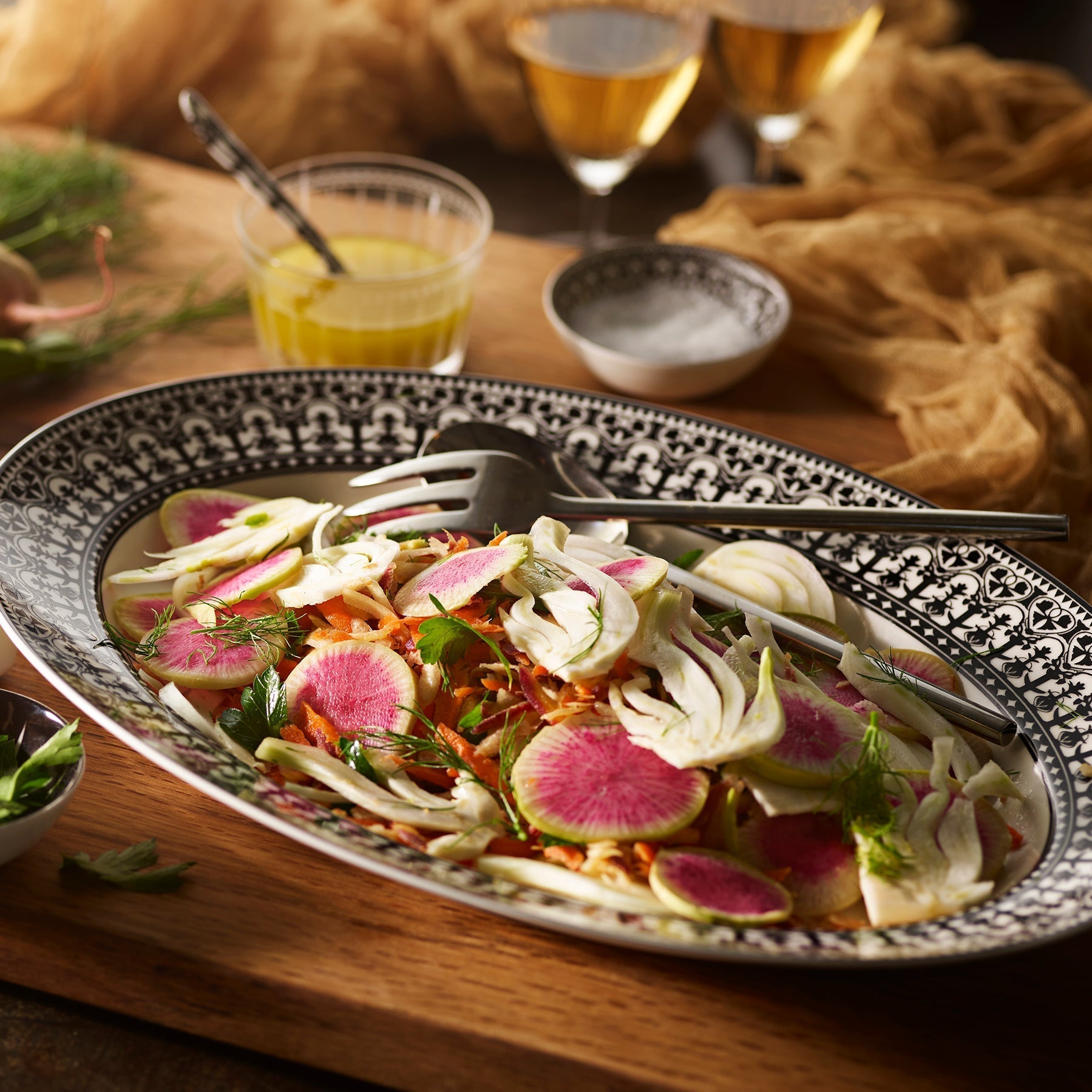 This generous porcelain platter serves up a crowd, bringing high style to the table.