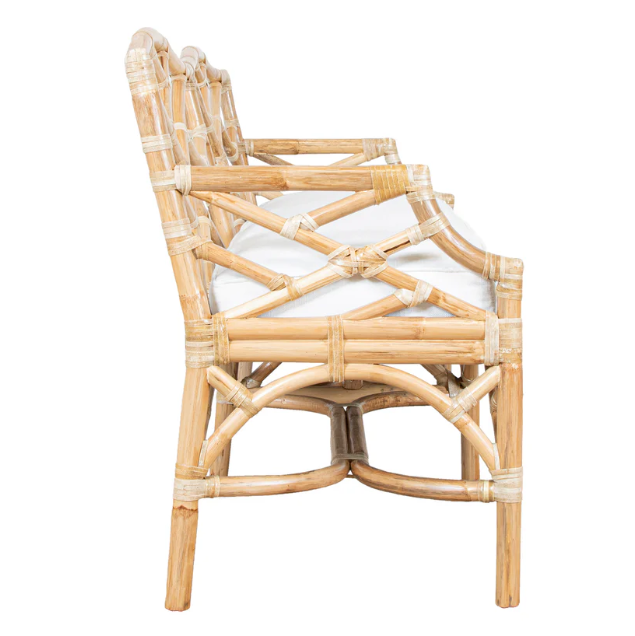 The Chippendale Loveseat embodies the grace of classic design paired with modern comfort. Handcrafted with an eco-friendly rattan frame and intricate leather bindings, this heirloom-quality piece adds a refined touch to any living space. Its upholstered webbed deck provides lasting support, while a variety of performance fabrics—including Sunbrella, InsideOut, and COM options—ensure both beauty and durability. For unparalleled comfort, elevate your seating experience with the optional Spring & Down cushion upgrade. Available in a selection of standard and premium finishes, the Chippendale Bench effortlessly blends luxury and versatility. Ready to ship within 6-8 weeks!