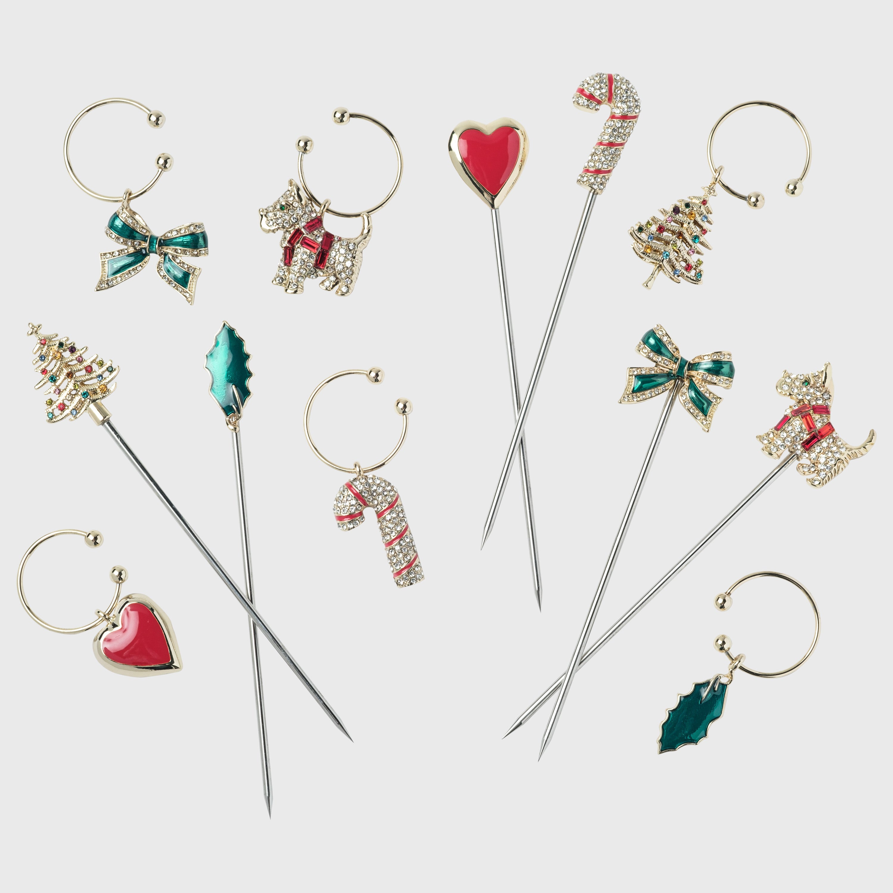 This Christmas cocktail party set is the ultimate hostess gift! It is super festive and so very useful! Everyone can have a custom cocktail or use the picks to decorate a cheese plate, and the wine charms to mark your glass... the ideas are endless....