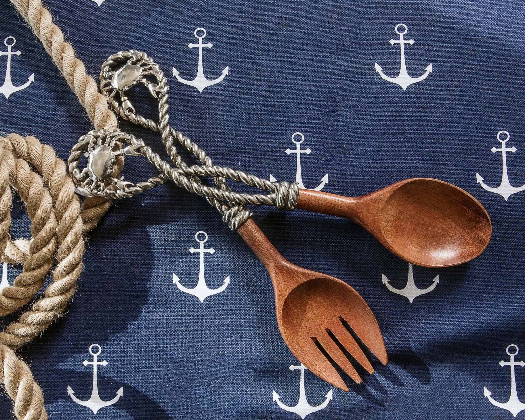 Elevate your table setting with Vagabond House's Unique nautical Salad Server set, a perfect blend of functionality and sophistication. The handles, cast from versatile Vagabond House pewter, cleverly depict twisted sailing rope with a stylish crab perching atop. Coupled with serving bowls carved from beautiful, durable acacia wood, the generously sized, 12"L servers reflect sheer elegance. These exclusive pieces will serve your sea-loving crew for many years and become a conversation starter in your next Nautical event.