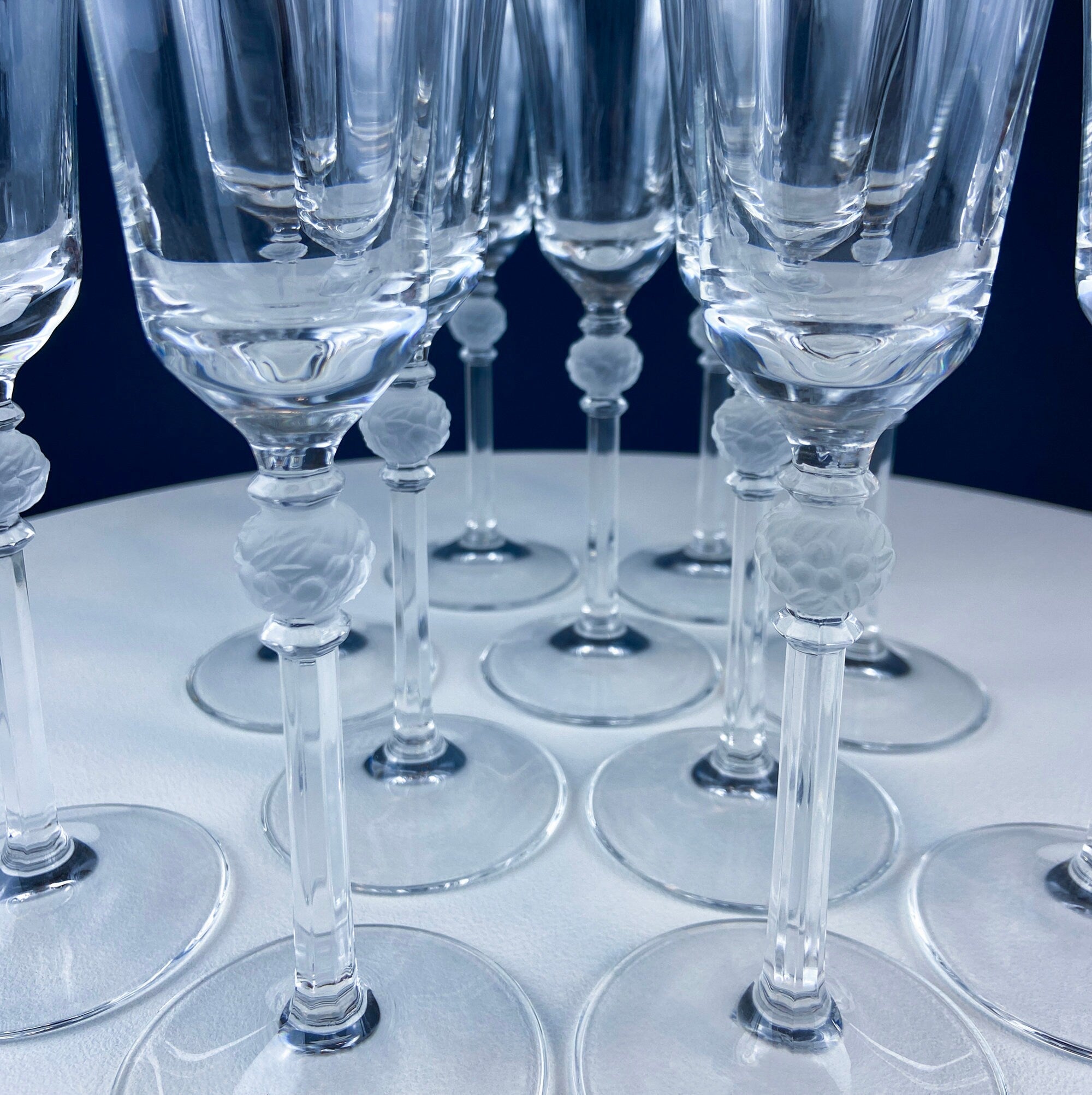 Crystal Champagne Flutes with Ball Stem. Enchantress by Mikasa. Frosted Ball Shaped like Berries and Leaves. Set of 11 Stemware. Beautiful Ping. Fine Dining. Like New Condition. Wedding Gift Idea. Wedding Toast. New Years' Eve, Holiday Celebration.