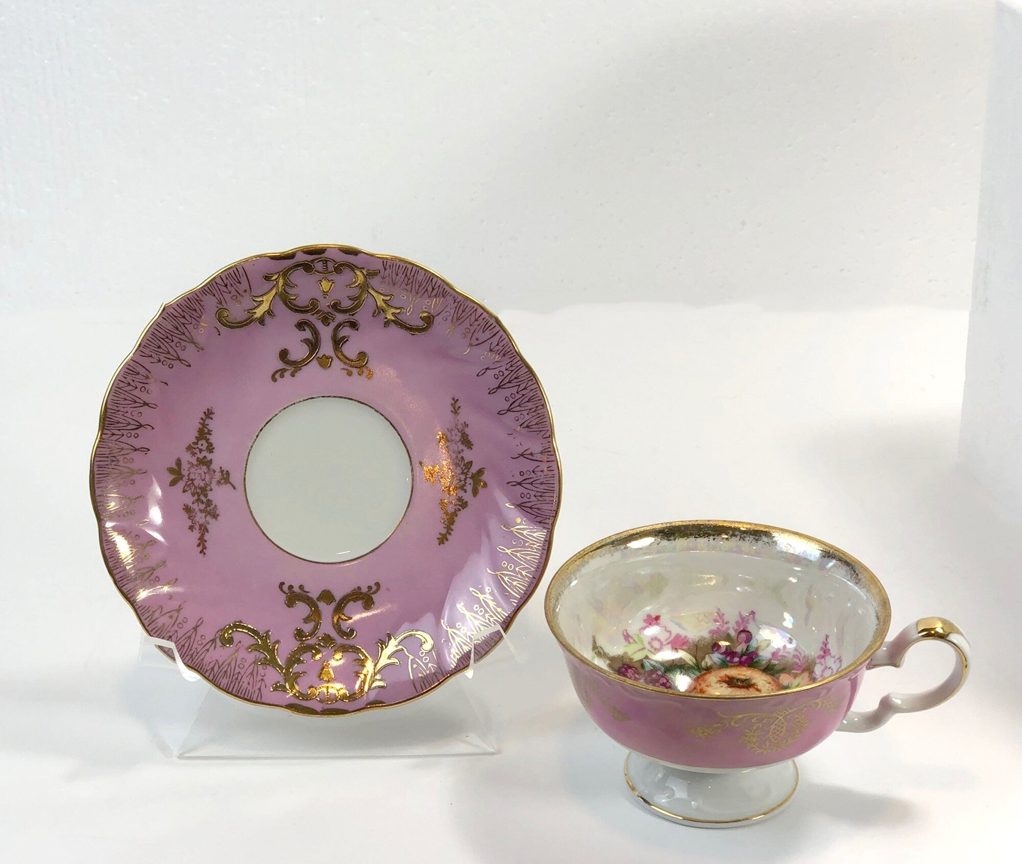 Vintage Cup by Royal Halsey LM and Saucer by Royal Sealy China. Mismatch Tea Set. Iridescent Cup Inside with Fruit Pattern. Pink Green Orange Gold. Christmas Gift Idea. Marked by manufacturers. Very good condition.