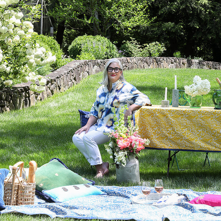These tablecloths are printed by hand with the traditional Indian block print technique. Each one is unique and any "imperfections" are what make them so perfect.