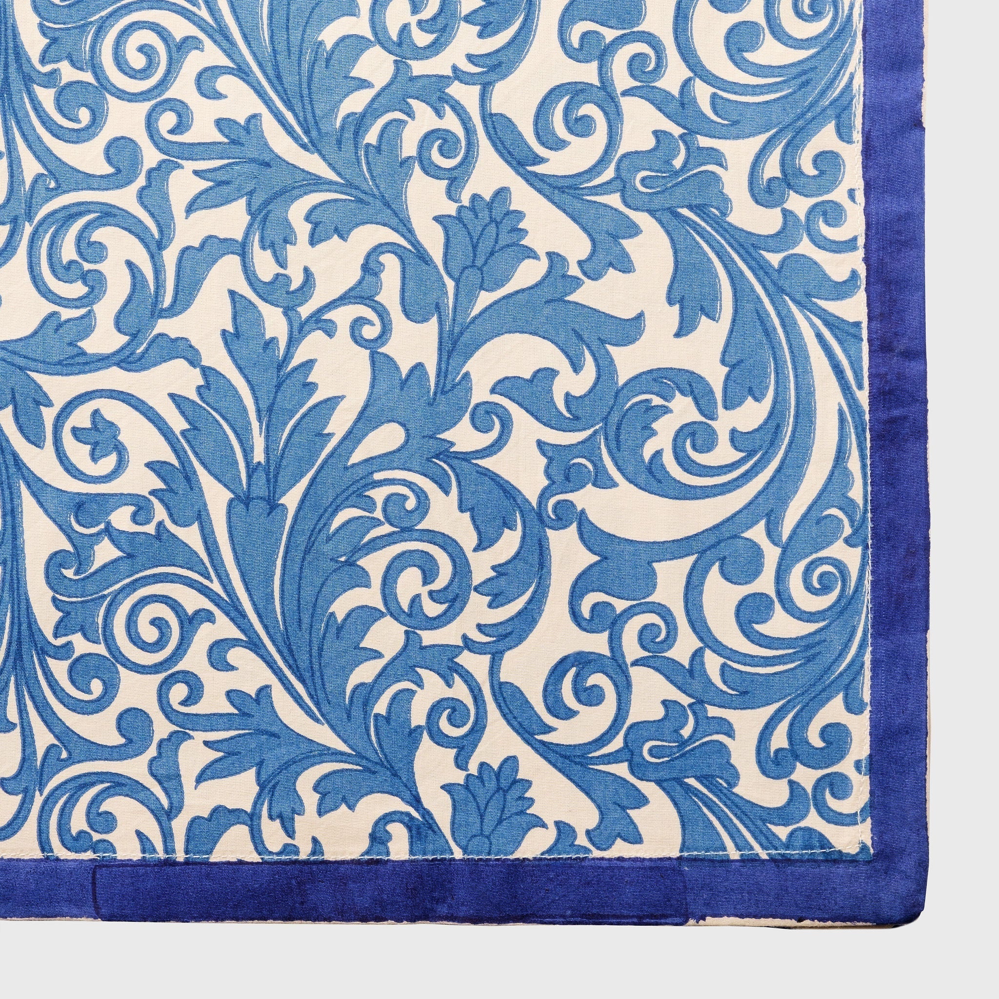 Features a vibrant indigo damask print with a bold cobalt border for a striking, colorful look