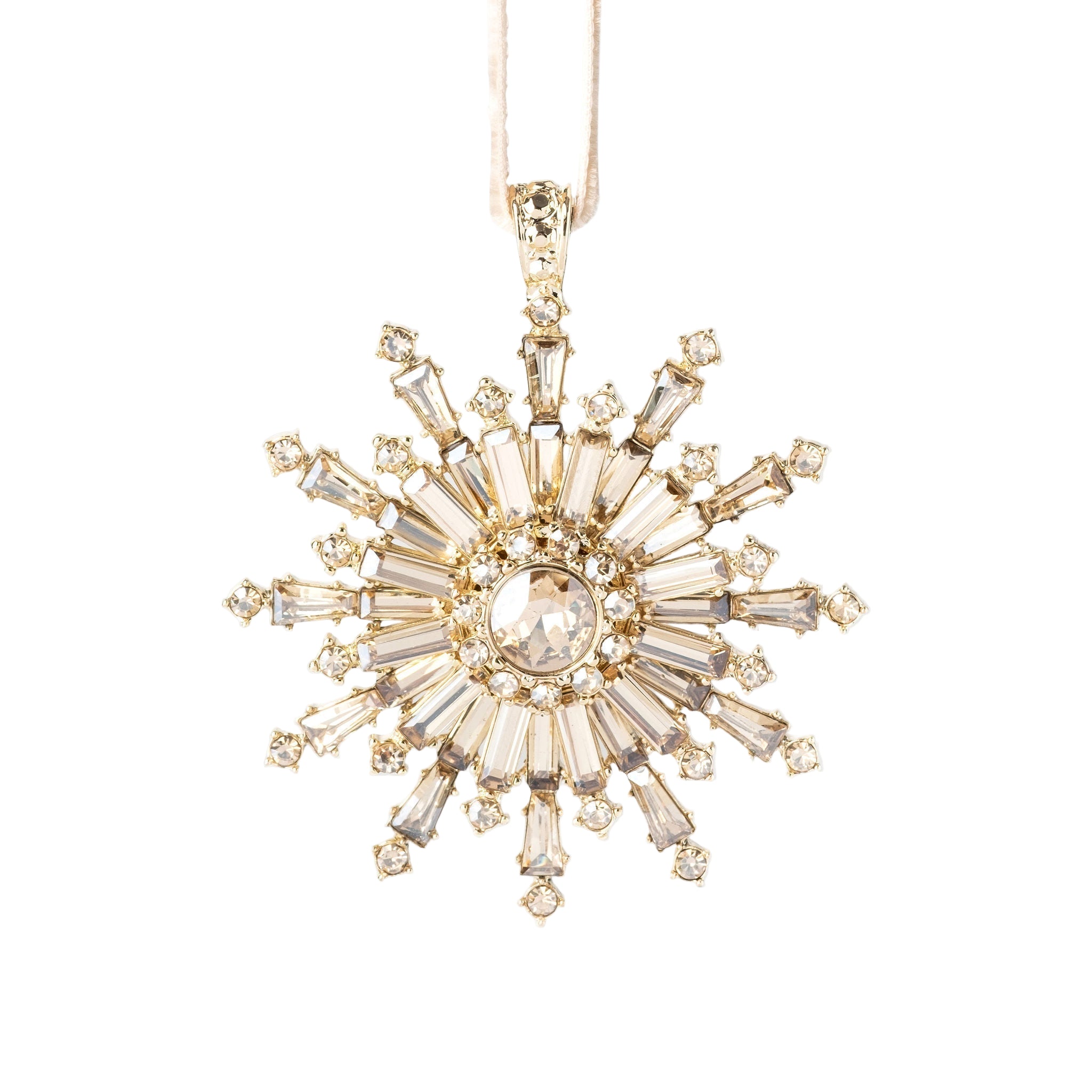 This shimmering gold snowflake ornament will certainly signal the celebrations to come! We used a pale gold glass stone on this ornament, so it's a super delicate color and stunning when used in multiples. Let it snow!