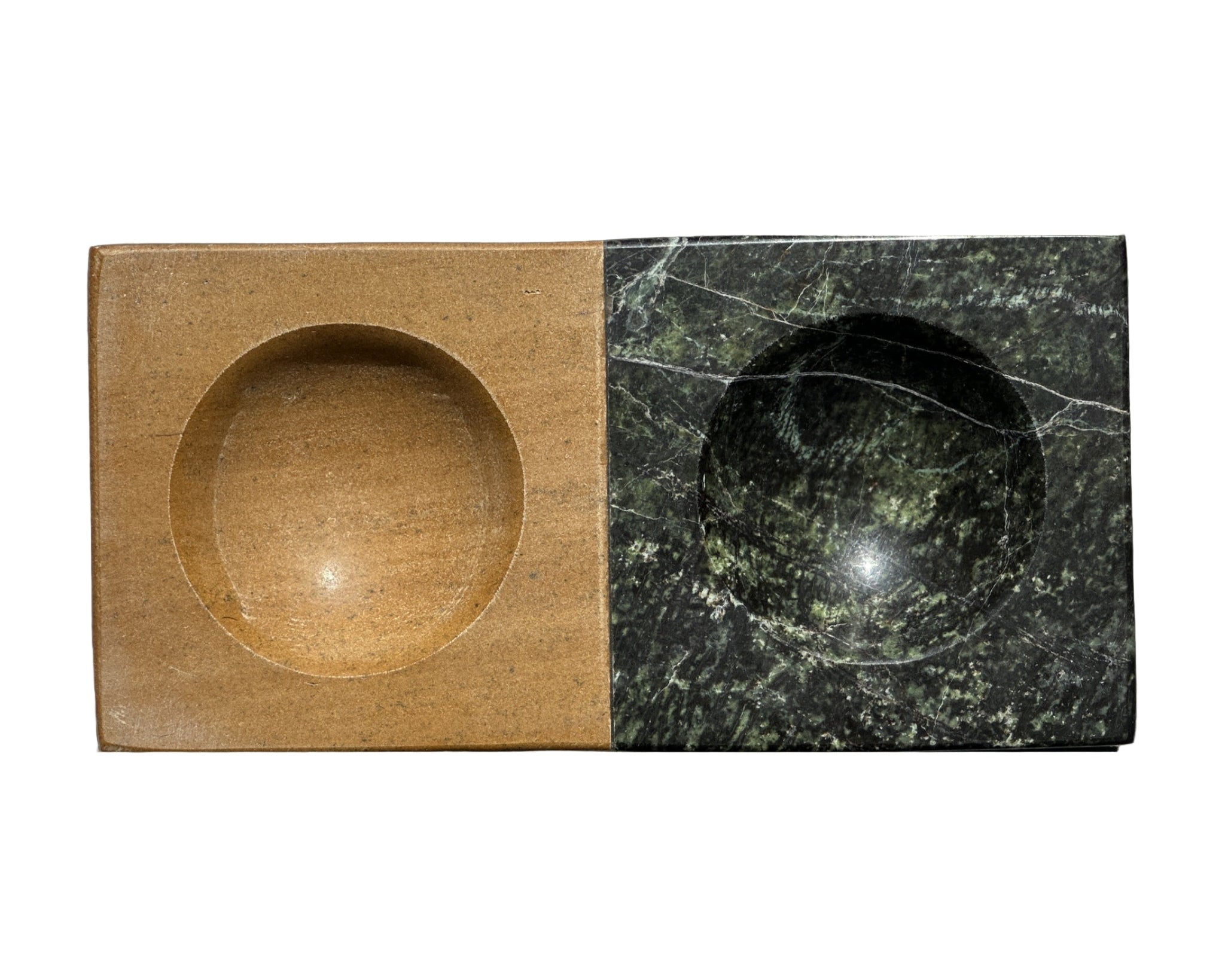 Carved from a pair of marbles, its surface is divided into twin concave basins—perfect for holding nuts and olives, salts and spices, or simply serving as a sculptural accent on a table or shelf. The duality of materials highlights the natural variation in color and veining, making each piece entirely its own.