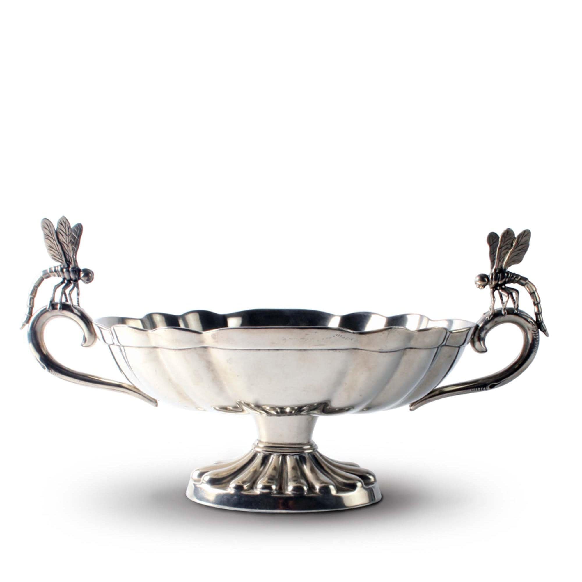 Exquisite attention to detail is captured in the Garden Friends Dragonfly Centerpiece, perfect for luxury entertaining and upscale outdoor gatherings. This centerpiece, boasting intricate dragonflies poised in realism on each handle, showcases an exceptional pewter finish. The symmetrical design is accentuated by scalloped edges on the rim and base, beautifully conveying its designer quality. Sized 9.5"W x 17"L x 10"H, its generous dimensions are ideal for both functional display and conversation-starting décor.