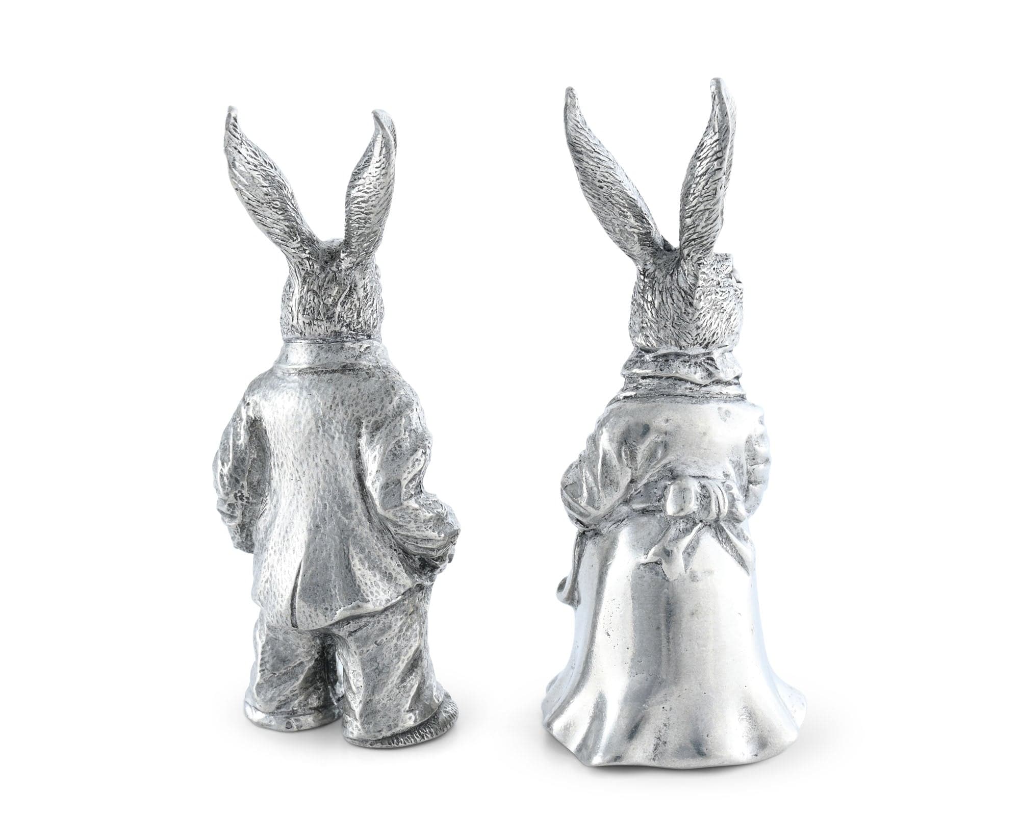 Introduce charm to your table setting with the unique Dressed Rabbits Salt & Pepper Set. Elegantly crafted in luxury-grade pewter, it showcases an adorable rabbit couple dressed in their Sunday best. The female, holding a carrot in a robe, and the male, in a bow-tie, both possess large, perky ears and intricate details imprinted on their faces. Their generous 4'' size, perfect for themed parties, brings a whimsical touch to your garden feasts, birthday occasions, or Easter brunches.