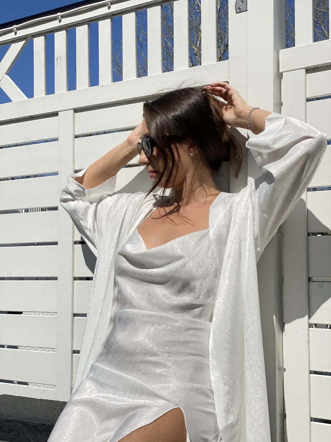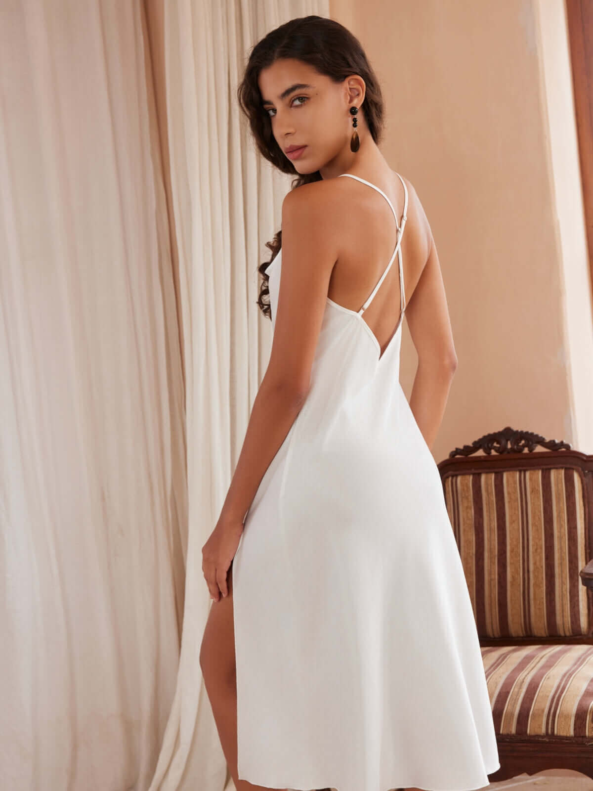 • Elegant Design: The pajama set features a long robe with a collar loop for easy hanging, a removable waist tie, and inside ties to secure closure. The slip dress is designed with side slits at the hem and adjustable straps, ensuring a perfect fit and a graceful silhouette.