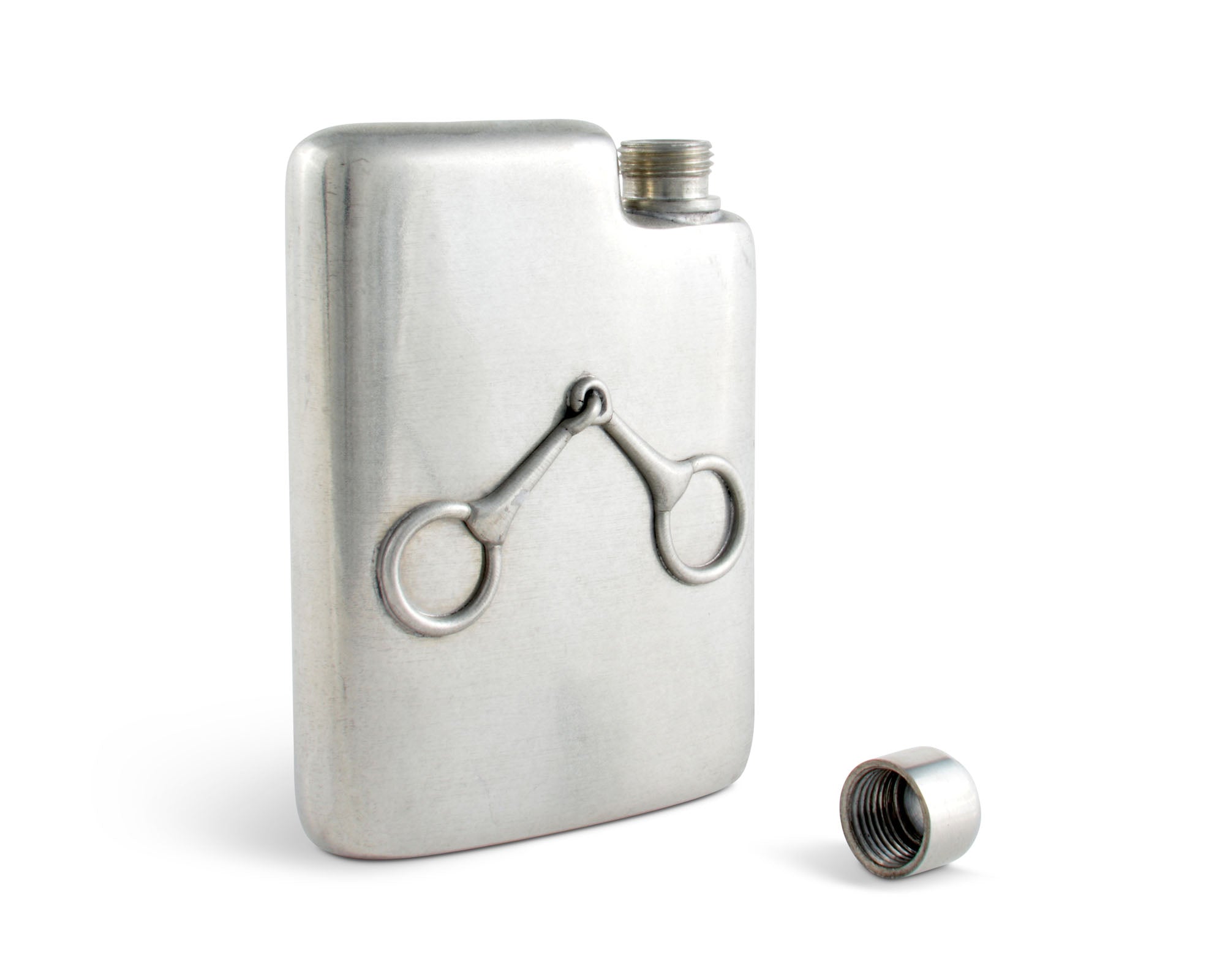 Specially crafted for equestrian enthusiasts, Vagabond House's exquisite pewter flask is your companion on long trail rides. With an O ring snaffle bit embellishment, its smooth curved design is as compact as it is stylish. Made of premium quality pewter, the flask's lustrous finish is evident at first sight. This flask, despite its petite sizing of 4.25"W x 3.25"T and 4 ounces capacity, is perfect for providing that wee nip of your treasured drink. A lifeline in the vast trail and an heirloom for your offspring, it is the perfect unique gift for equestrian enthusiasts who appreciate liquor flasks.