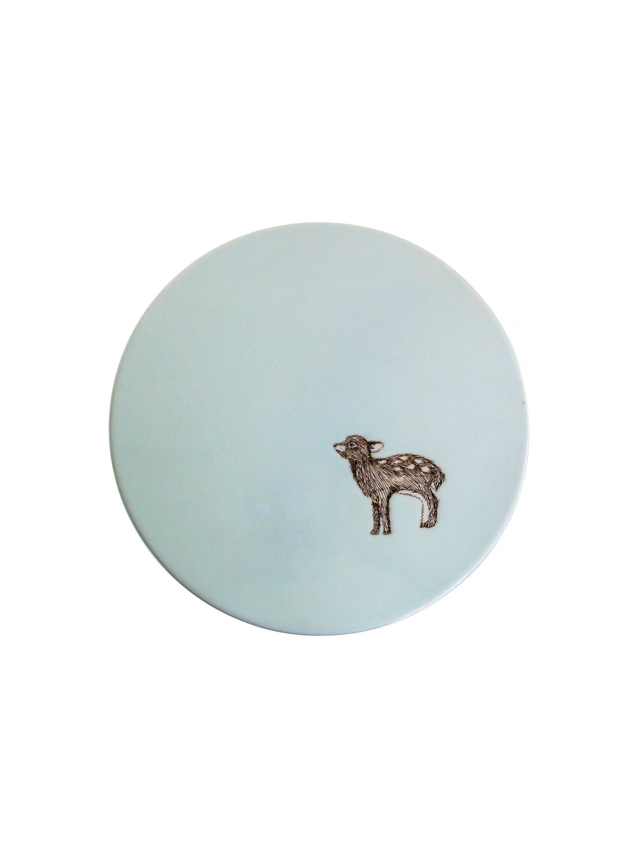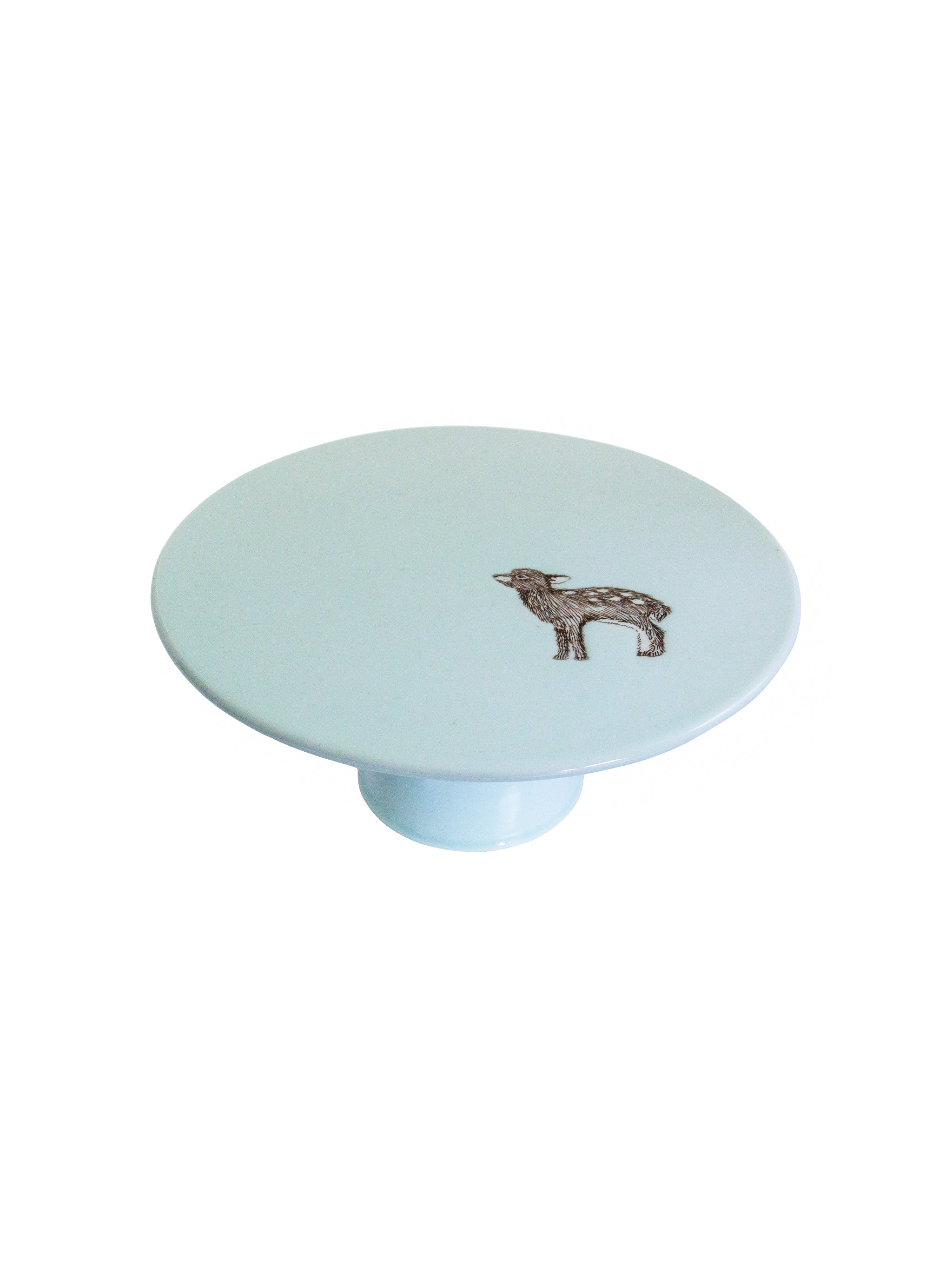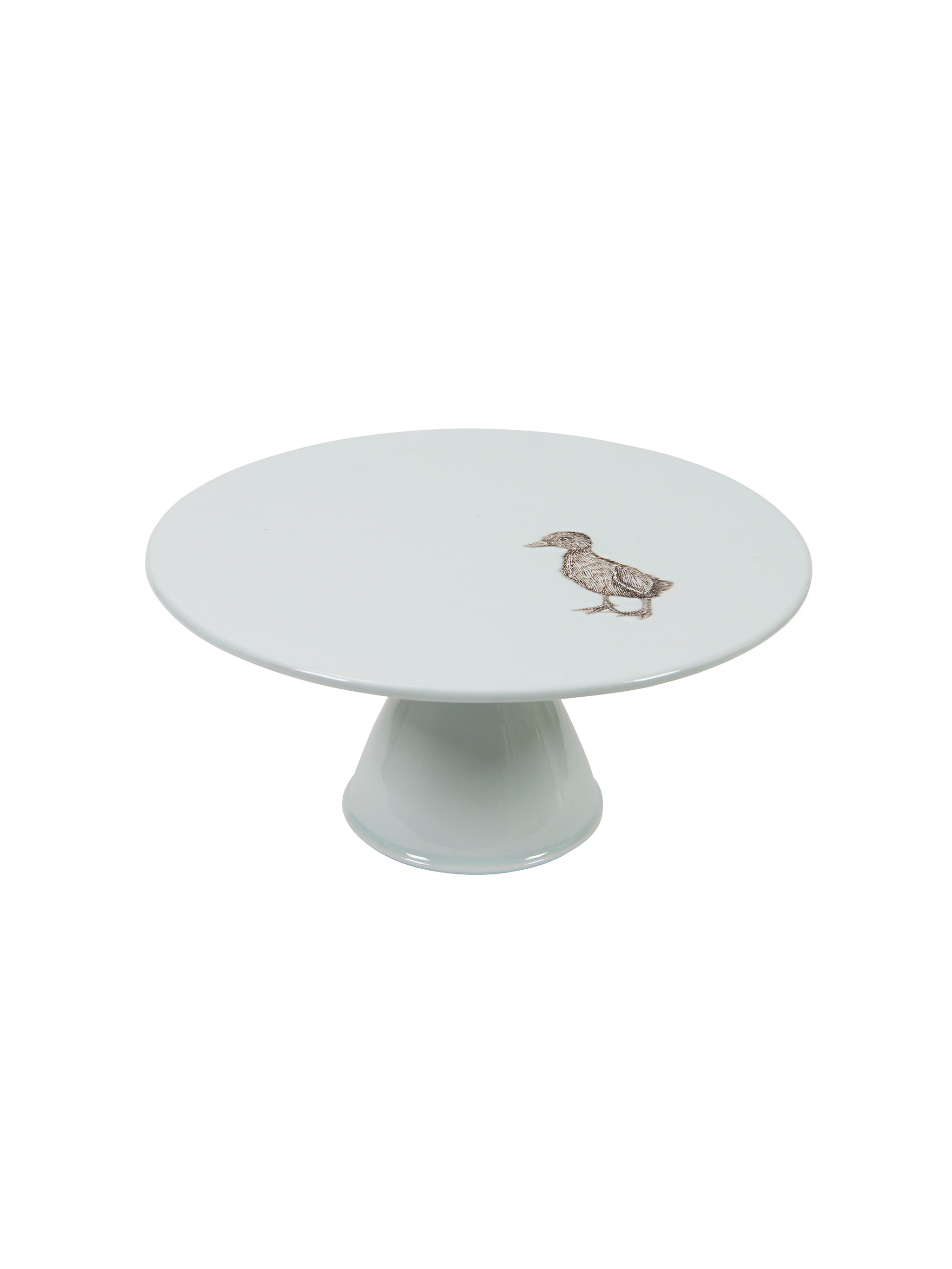 A collection of originally illustrated heirloom quality American made ceramic cake stands in a beautiful celadon or white finish.