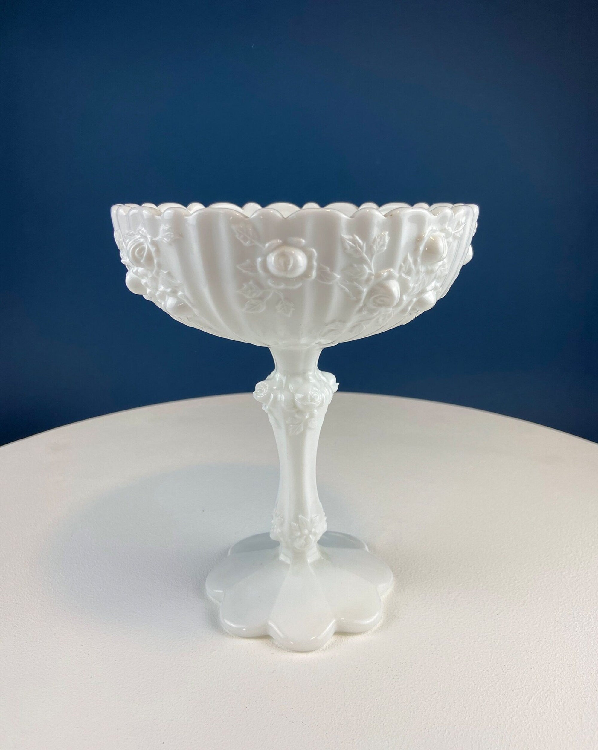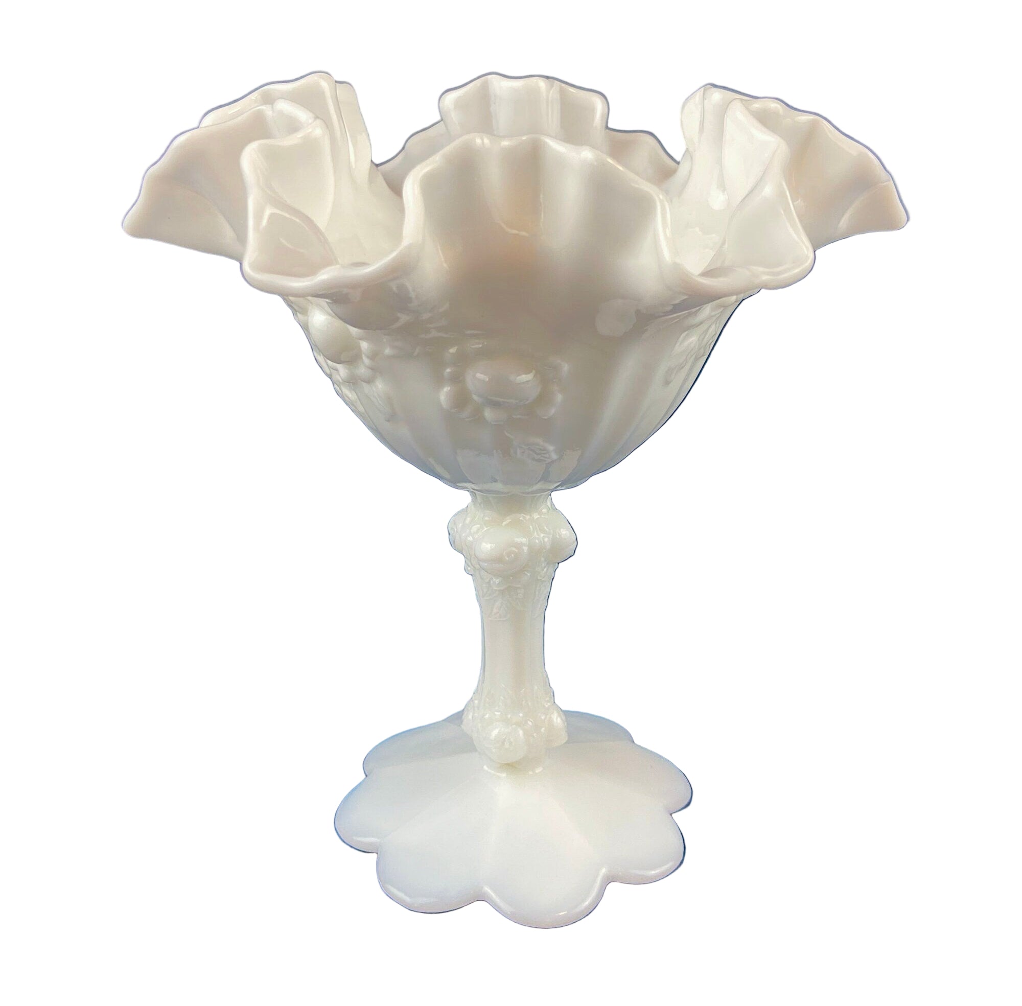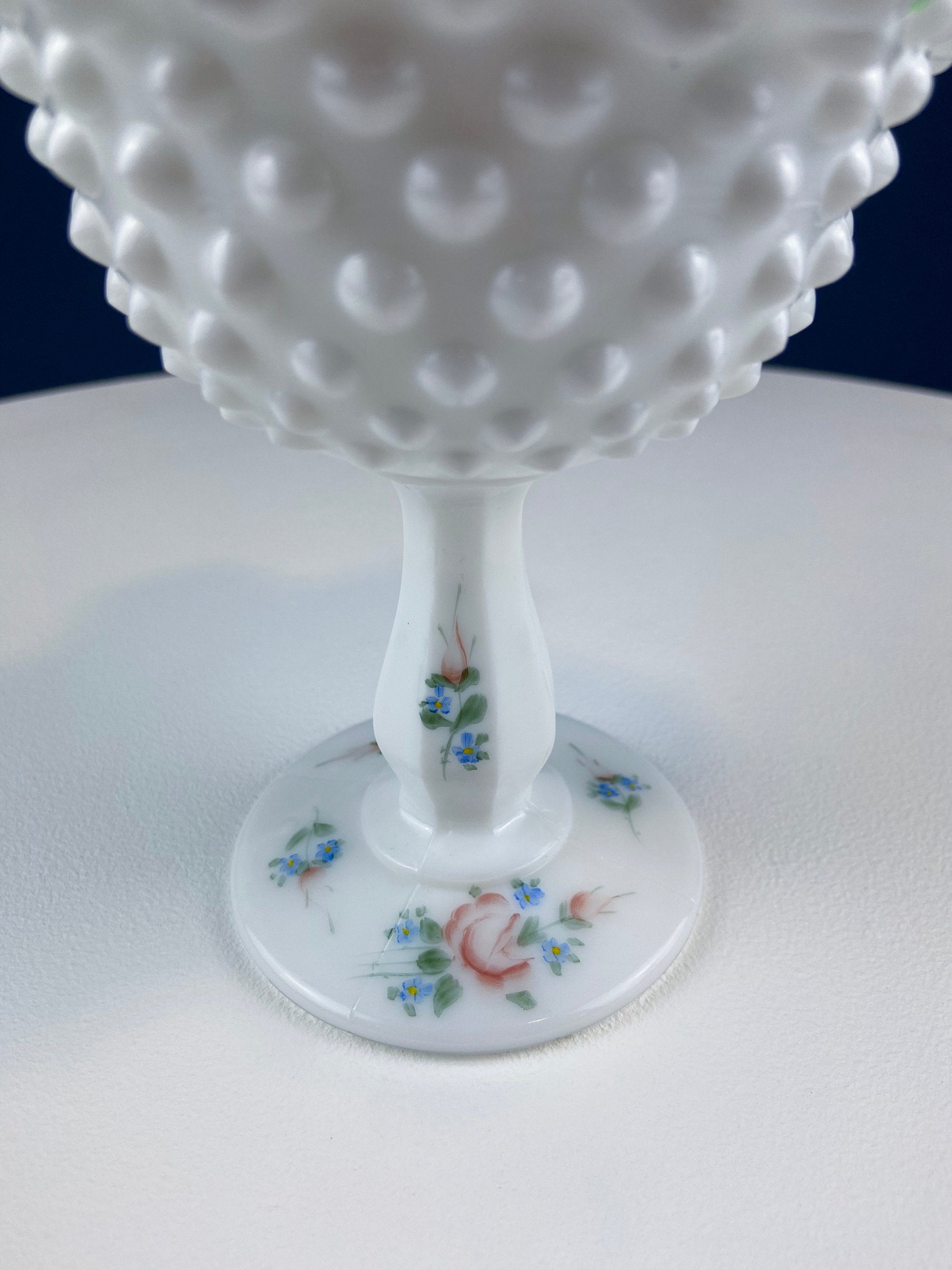 Fenton Hand painted Milk Glass Compote. White, Footed, Hobnail Bowl with Ruffled Rim and Pastel Flowers. Wedding Gift. Modern Farmhouse. Signed by the Artist: Janet Chapman. It is in excellent condition. No cracks, chips or any other damages. Marked by the Manufacturer.