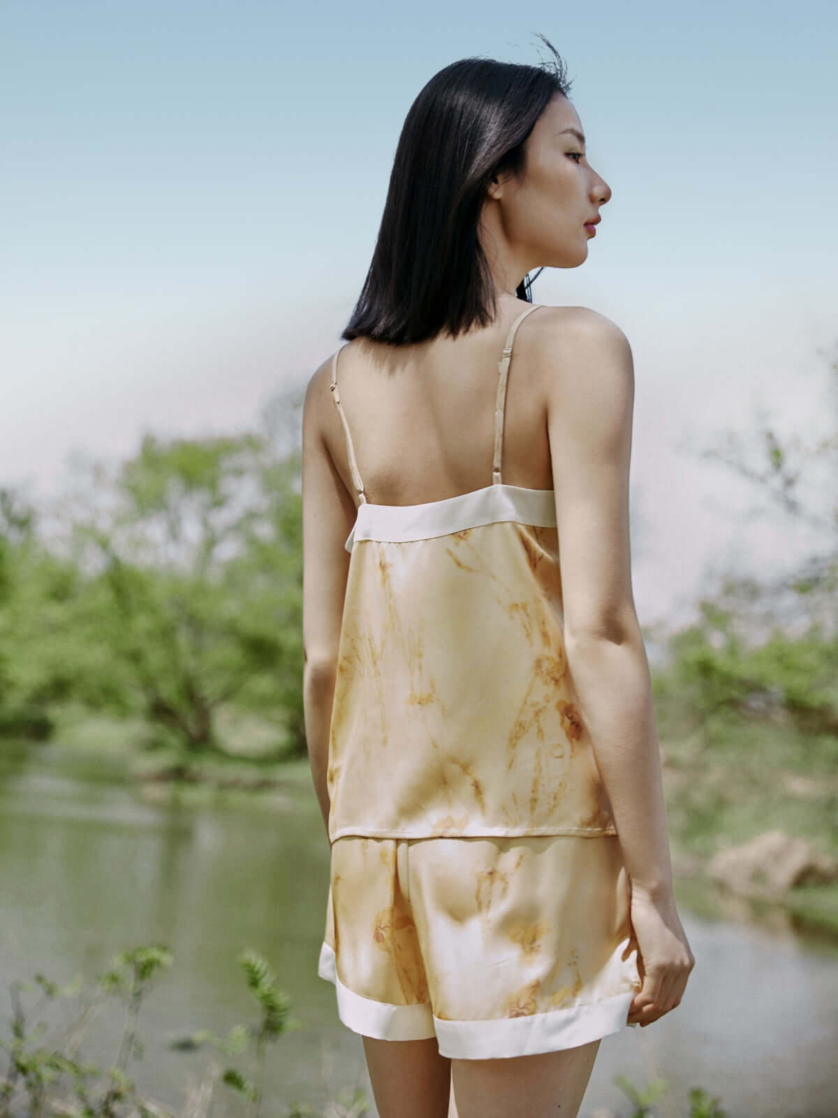 • Unique Design: This short pajama set's fine sewing craftsmanship reflects Ulivary's luxury.The V-neck of the camisole and the hem of the shorts are sewn with wide white edges, creating a layered contrast effect with the yellow tie-dye print. The shoulder straps of the camisole can be adjusted freely as needed.The shorts' waistband is adjustable with an elastic band and have two side pockets for storing personal belongings.