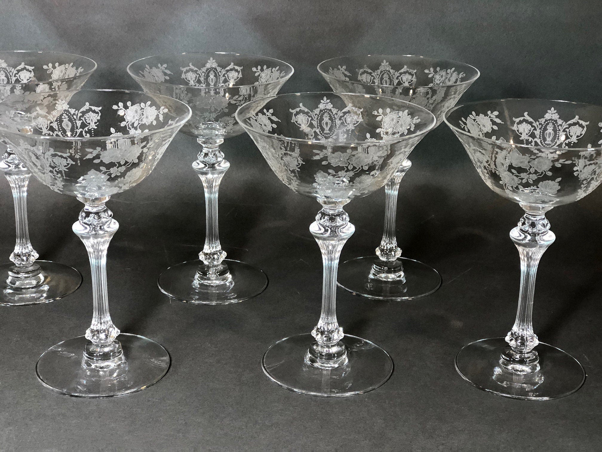 Fostoria Low Sherbet Glasses. Etched Meadow Rose Motif. Set of Ten Vintage Wine or Dessert Glasses. No chips, cracks, or clouding. Perfect Christmas gift idea for a father for him. The price is for ten glasses.
