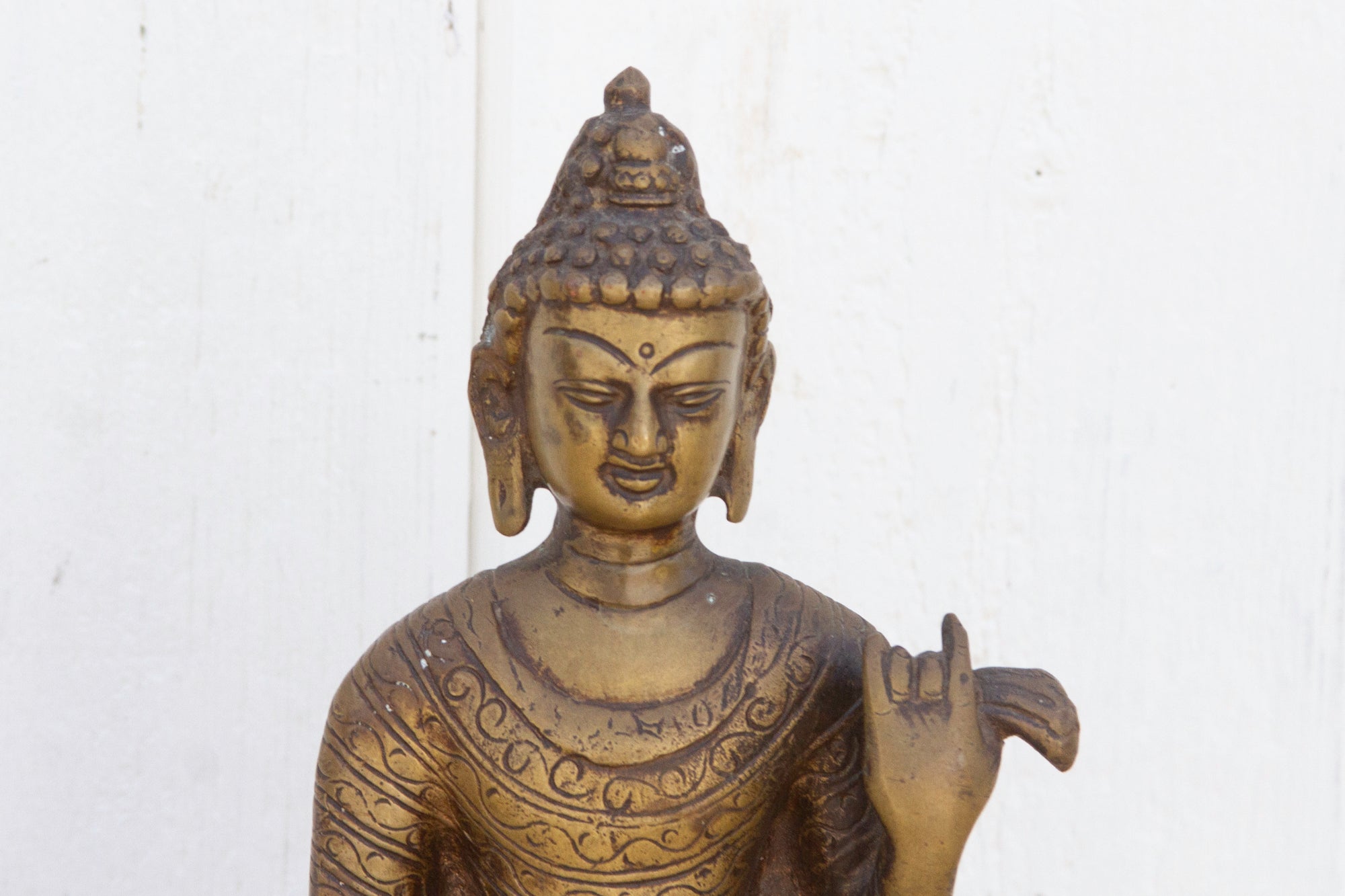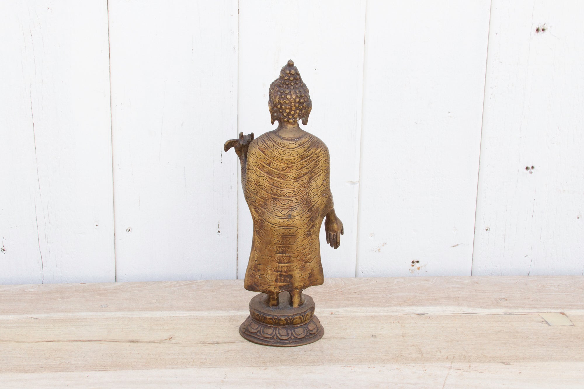 A gilt brass statue of Gautam Buddha standing dressed in all pleaded robes with carved designs. The buddha raises its left hand in Mudra and right hand pointed downwards in Varada. It retains an oxidized aged patina and its facial features are sharply defined with long earlobes and a calm nirvana expression.