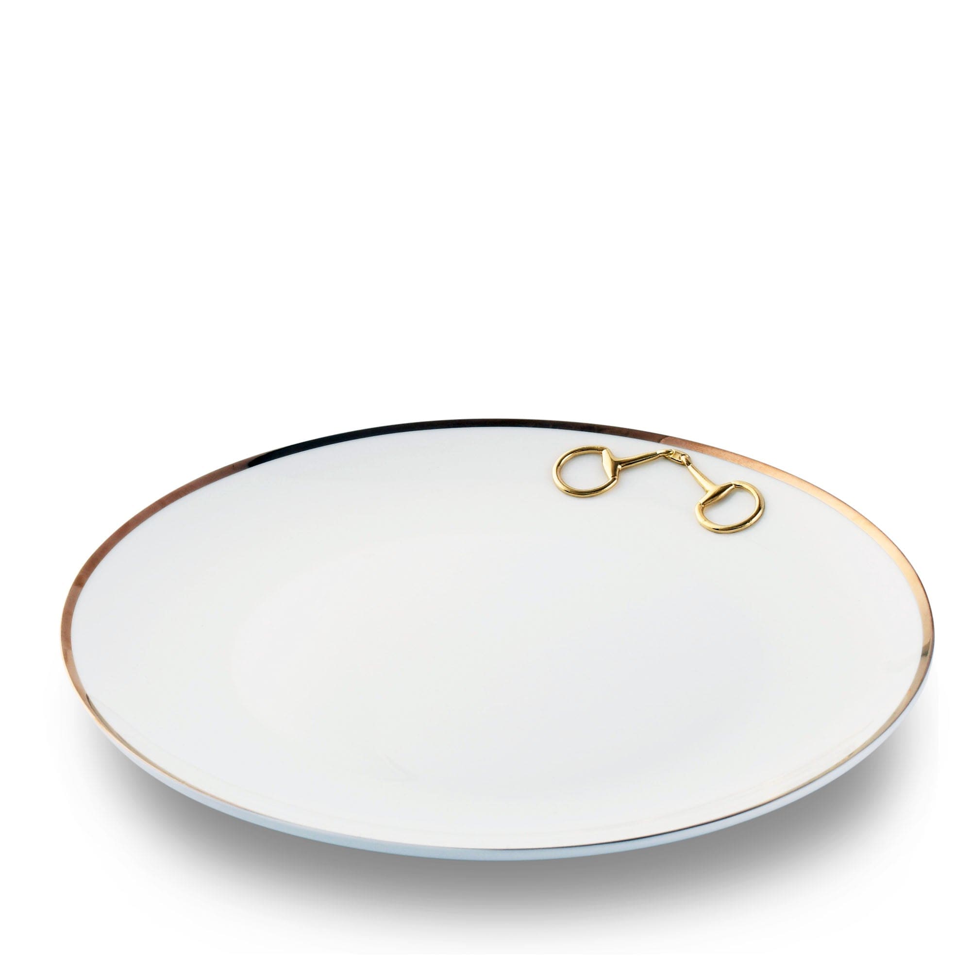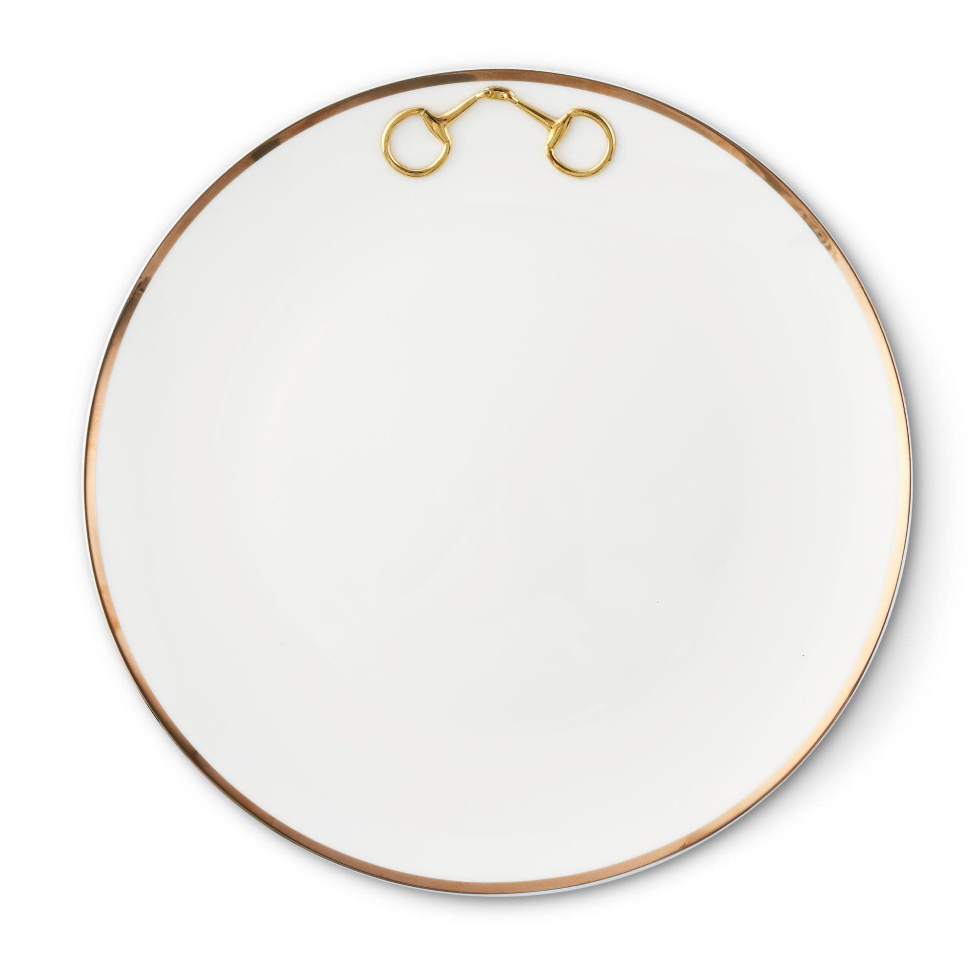 Embrace the elegance of equestrian sophistication with our 10.5 inch diameter Gold Bit Bone China Dinner Plate designed for special occasions and holiday entertaining. The enchanting design of the gold pewter bit and rich golden rim adorns the generously sized Bone China plate showcasing an exquisite blend of craftsmanship and quality. This designer dish perfectly complements any dining decor and is a perfect gift for any equestrian enthusiast.