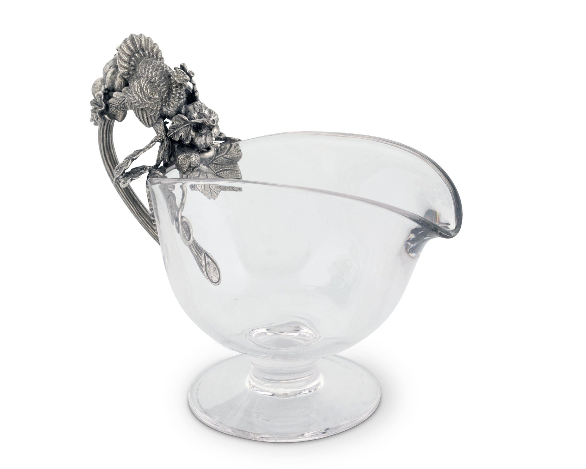 Enthrall your dinner guests with our Vagabond House Harvest Turkey glass gravy boat, a unique luxury gift for autumn festivities. Celebrating the rich abundance of the season, this hand-blown glass gravy boat is adorned with intricately detailed, handcrafted pewter decorations consisting of pumpkins, fall leaves and a noble turkey. The amply sized, curved bowl holds a generous amount of gravy, perfect for Thanksgiving feasts, while the transparent pitcher showcases your homemade gravies and sauces. Its sturdy pedestal base protects your table, and the non-drip spout lip ensures effortless pouring.