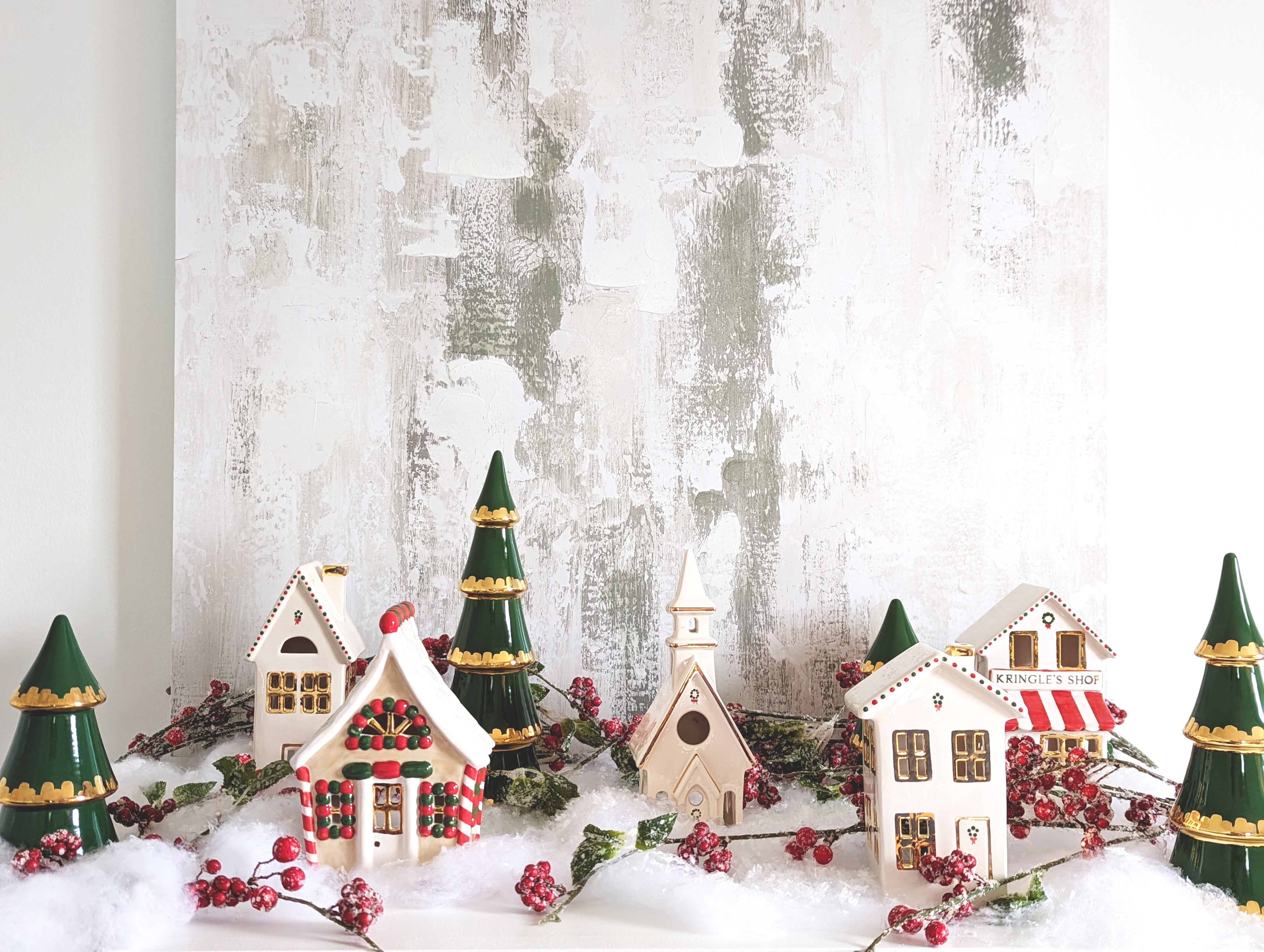 This beautiful hand-painted village is sure to become a treasured holiday heirloom. The three piece set includes two cottages and a chapel adorned with festive lights and wreaths. Each piece holds a tea light or fairy lights inside which allows warm twinkly light to shine out through the windows to create a dreamy winter wonderland.