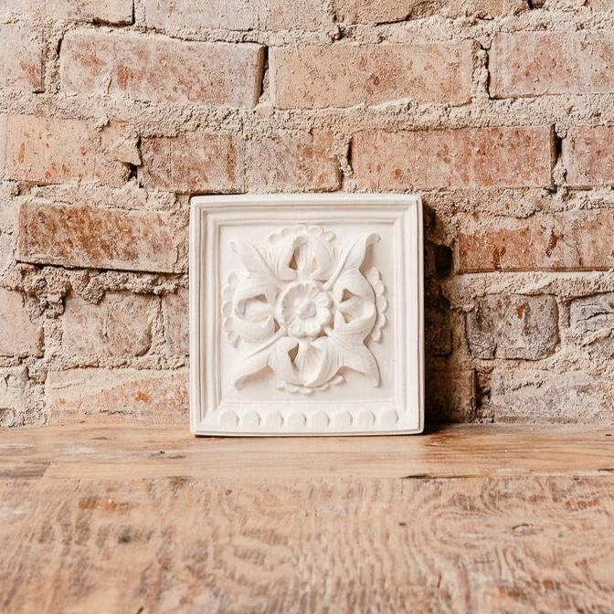 The House Parts collection of botanical plaques replicate designs from a 19th Century oak-paneled room. Each wood panel was capped with a different botanical design.